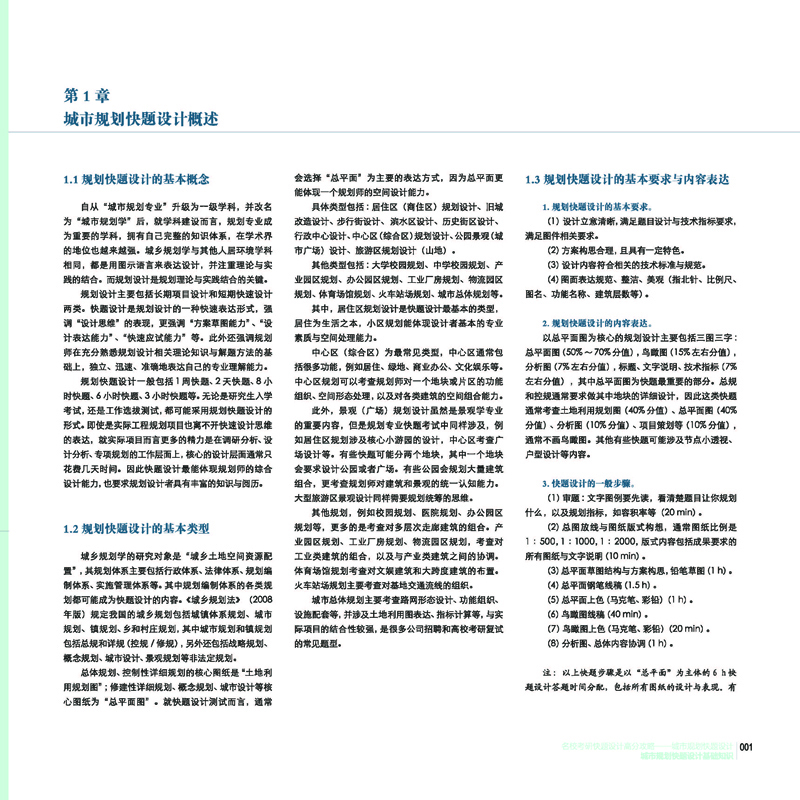 全书共4章,第1章是城市规划快题设计概述,介绍了城市规划快题设计的基本概念、基本类型、基本要求、内容表达、常见问题及复习方法。第2章是城市规划快题设计知识准备,从总平面图设计、建筑布局要求、主次入口的设置、交通与流线设计要求、停车场(位)设计、快题指标说明等方面入手,阐述了快题设计中需要注意的相关规范、规定与设计方法。第3章是城市规划快题设计表现,讲解了快题考试常用工具的分类与应用、图面设计与表现要点。第4章是城市规划快题设计案例浅析与点评,并对不同院校、不同类型的历年研究生入学考试的相关真题做了整理、归纳与浅析。