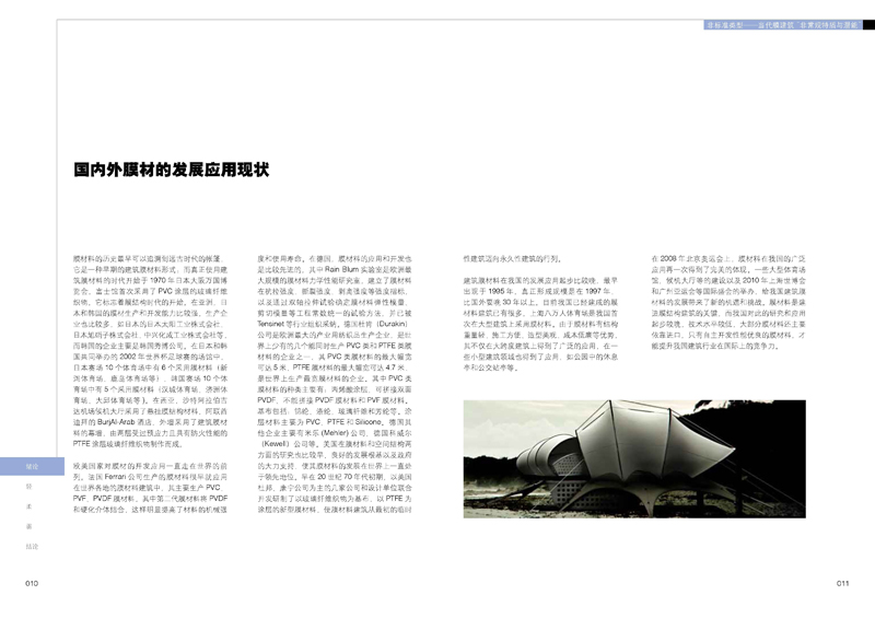 本书通过对国际优秀膜材料建筑案例进行分类、归纳、总结,用三个章节系统全面地讲述了膜材料的特质:轻、柔、弱,以及由此特质带来的各种可能性。根据这些作品的精炼而独到的简要分析,使膜材料从建筑领域跨越到其他领域,不断地革新、发展、飞跃,以此展望未来膜材料的建筑表现潜力。