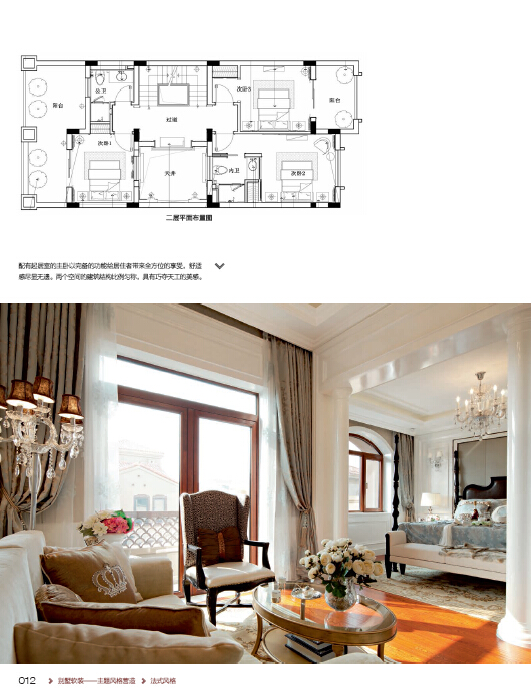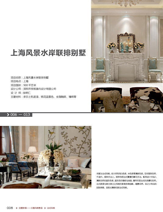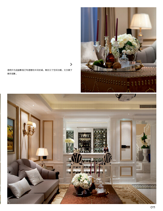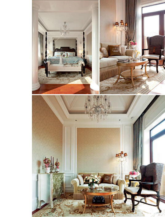 本书所枚举的案例中的每个功能区域都有相应的极为全面而周到的设计,从玄关、门厅、餐厅到卧室、娱乐室、酒窖等各场所既存有自身的独特属性,又相互有机关联,铸就和谐、统一的整体风格。设计师对家人关怀备至,通常为其预留出适当的表现空间,方便家人适时地添加生活中的趣味性元素。另外,别墅的使用性质在当下被提升到空前的高度,成为继业主主观意愿之外的影响软装设计的又一决定性因素。在绝大部分项目中,家具、配饰及陈设等已经变被动为主动,成为空间形象的掌控者与塑造者,并自动的组织空间、提升空间的服务质量和艺术感染力,形成新的设计理念,赋予室内空间个性化的文化内涵和风格特色。
