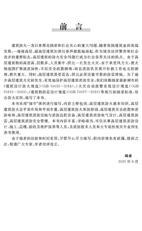 本书依据国家最新颁布的《建筑设计防火规范》(GB50016—2014)编写,共分为八章,内容主要包括:高层建筑防火基本知识、高层建筑防火总平面布局和平面布置、高层建筑防火和防排烟、高层建筑安全疏散和消防电梯、高层建筑消防设施与消防监控设备、高层建筑消防电气设计、高层建筑防雷、高层建筑消防安全管理。