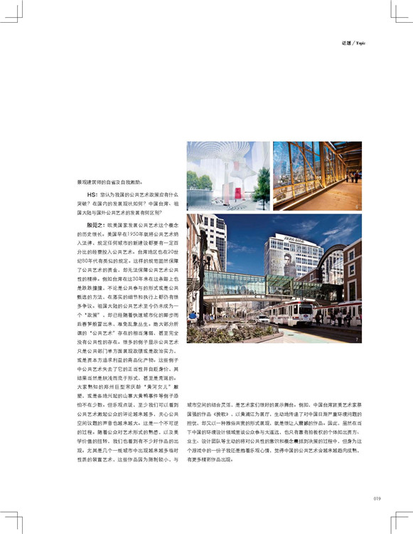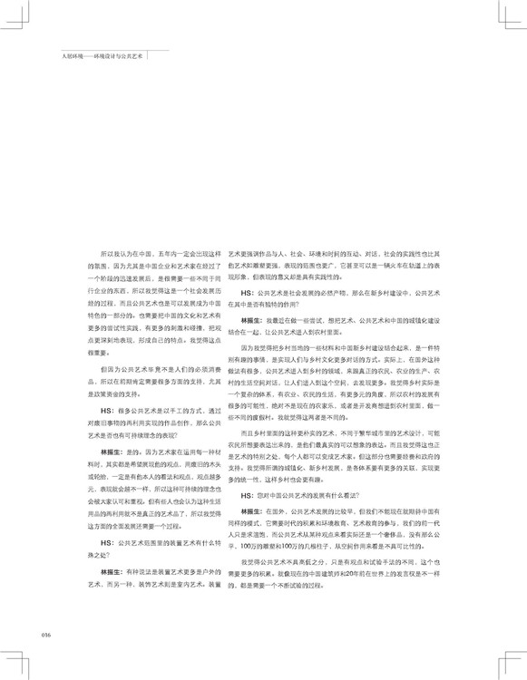 一本以“环境设计和公共艺术”为主题展开的关于公共艺术的形式以及表现方法的讨论和探讨。大多数人理解的公共艺术就是“放置在公共空间的艺术品”。其实这个定义太过于局限公共艺术这个概念。但真正深究起来其实公共艺术本身就是一个矛盾的课题。因为艺术是艺术家自我意识和创作的表现,又如何展现公共意志呢?但放到实践层面上,我认为公共艺术至少要被理解为“在创作的过程及含意上具有公共性,同时在陈列上具有公共群众轻易的可及性及开放性”这两个定义。当然,什么是公共性,又或什么是开放性都可能要一本专书才能讲完,但简单来说公共艺术应该是创作者透过艺术表现形式来诠释、展现公共群体的议题、记忆,或公共艺术本身就是公共群体共同创作的产物。事实上,最高明的公共艺术不仅仅可以被动衬托,展现人与环境间的结合,它还可以主动地将使用者与环境联结在一起。一件有野心的公共艺术作品可以提升社会大众对某一特定公共议题的注意,进而翻转一个空间,甚至一个特定族群的凝聚力及自发的力量。又或者它自身也会成为公共议题的一部分,或者引发一系列的公共议题,并让公共性在这个过程中显现。例如法国涂鸦艺术家Julien Malland去年在上海的老里弄动迁工地中的壁画引起了公众的注意,却也另老里弄一夕间被拆光, 凸显了动迁在城市中造成的种种问题,这就是一个很好的例子。
