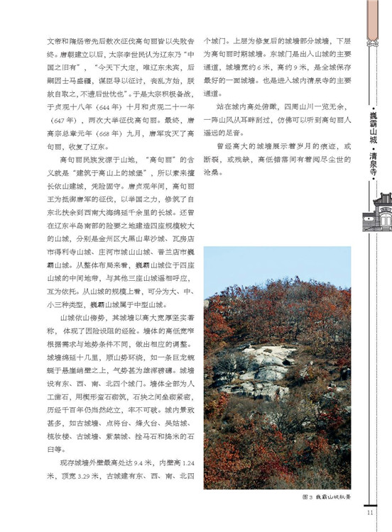 巍霸山城,又名吴姑城,坐落于普兰店市星台镇葡萄沟村的巍霸山上,距离大连市约129 公里。始建于东汉光武帝时期的巍霸山城,距今已有 1900 多年历史。巍霸山,地处碧流河右岸,海拔约 420 米,基本地貌为中央高,向东西两侧呈阶梯状降低,直至海滨,构成山地、丘陵半岛的地貌形态。夏无酷暑,冬无严寒,属海洋性过渡气候。巍霸山位于辽东半岛南端,东、西、南三面临海,是辽南古代的交通要冲,注定了此地的血雨腥风。战乱一直充斥在这片土地上,山林之中,古老的山城由此走来,防御,是无奈的第一要务。素擅凭高建城,依险固守的高句丽在此抵御了强大的隋唐。近几年从巍霸山城内出土的高句丽时期的地下宫殿遗址,环手铁刀、开元通宝等文物也印证了其不凡的历史地位。山城曾经的沉寂与崛起都在那青山绿水中绵长蜿蜒。巍霸山城秋景。