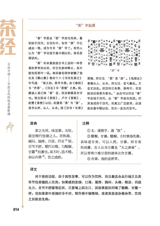 《茶经》是我国第一部系统地总结唐代及唐代以前有关茶事的综合性茶业著作,也是世界上第一部茶书,在当时就已竞相传抄。《新唐书隐逸传》说陆羽著《茶经》后“天下益知饮茶矣”。当时卖茶的人甚至将陆羽塑成陶象置于灶上,奉为茶神。本书除对茶经进行忠实的译注外,更新增了现代的茶知识、茶礼、茶趣、茶保健,让爱茶人士,讲究生活品质的人士更进一步提高对茶的认识。四色印刷,图片精致,布局优雅,堪称现代茶经,也是人民馈赠亲友的高品质礼品。