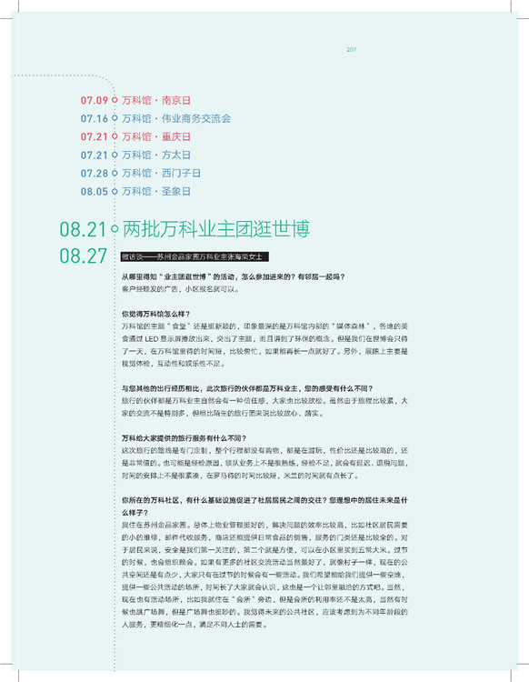 全书以时间为主线,依照场馆的筹备、规划、设计、建造、运营以及后世博遗产的文件保护计划这一进程分为6个部分。共有十余位主创人员记录了每一个阶段的心路历程:灵感碰撞、矛盾激发、方案升级、圆满落成,以至于情绪的波动也都有细微呈现。使读者能够身临其境地参与到一个巨大项目从筹备到落实的跌宕起伏。每一部分的档案环节还摘有具体的规划图、设计图、施工图、流程图等,更能深度解密万科馆这条“中国龙”的前世今生。万科馆是中外企业界乃至城市间密切交流的桥梁与纽带,促进了中意两国文化、经济和商业等各领域的交流,向世界展示了当代中国的精神风貌和当代中国人的生活面貌。后世博遗产的“龙•计划”也为文物保护工作开拓了新的思路。