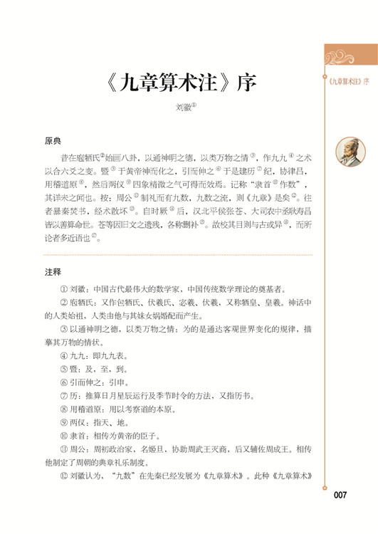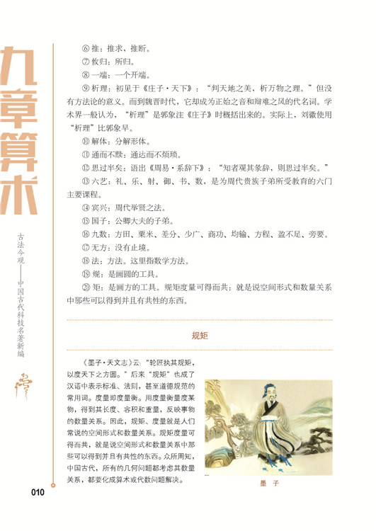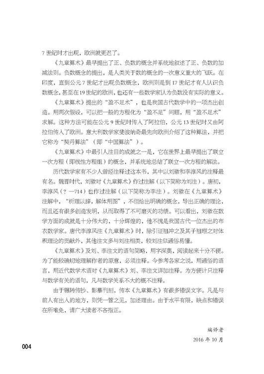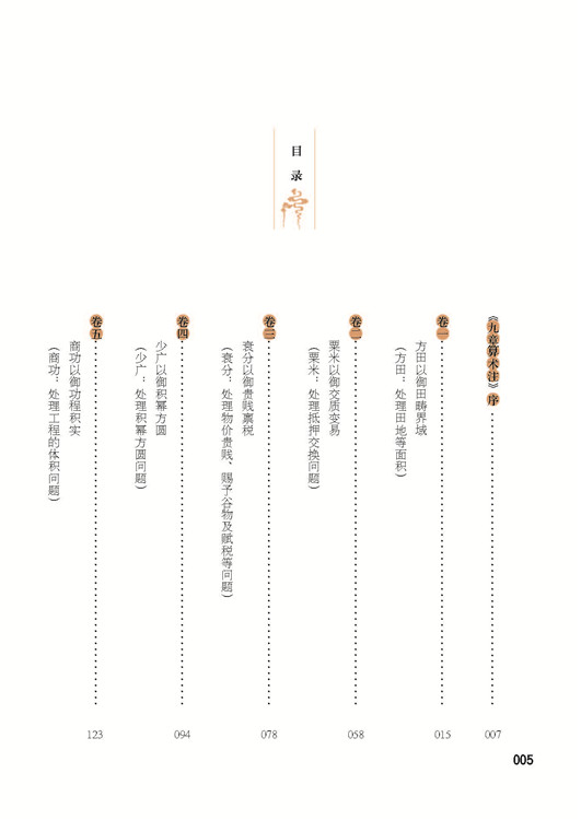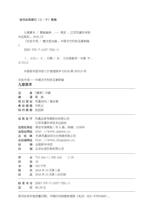 《九章算术》是中国古代数学专著,是算经十书中重要的一种。该书系统总结了战国、秦汉时期的数学成就。全书采用问题集的形式,收有246个与生产、生活实践有联系的应用问题,其中每道题有问(题目)、答(答案)、术(解题的步骤,但没有证明),有的是一题一术,有的是多题一术或一题多术。本书对其原典进行了精准的注释和翻译,方便读者进一步了解中国古代在数学方面的先进水平。由此,使本书既具有科学的实用性,也具有一定的文化性。
