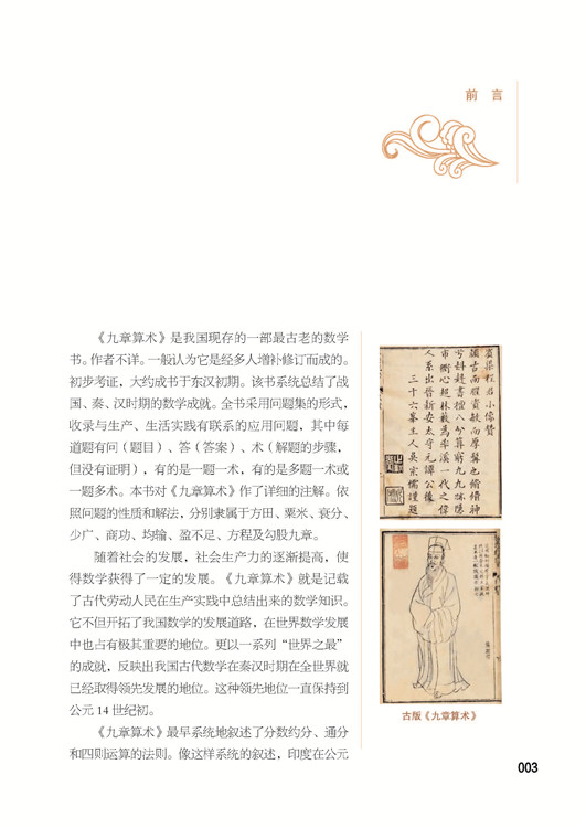 数学, 作为人类思维的表达形式, 反映了人们积极进取的意志、缜密周详的推理及对完美境界的追求。中国是世界文明古国之一。数学是中国古代科学中一门重要学科,其发展源远流长,成就辉煌。《九章算术》是中国古代的数学专著,是算经十书中最重要的一种,也是一种可以提高智商的中国古代的数字游戏。该书系统总结了战国、秦汉时期的数学成就。全书采用问题集的形式,收有200多个与生产、生活实践有联系的应用问题,其中每道题有问(题目)、答(答案)、术(解题的步骤,但没有证明),有的是一题一术,有的是多题一术或一题多术。本书对其原典进行了精准的注释和翻译,方便读者进一步了解中国古代在数学方面的先进水平。由此,使本书既具有科学的实用性,也具有一定的文化性。
