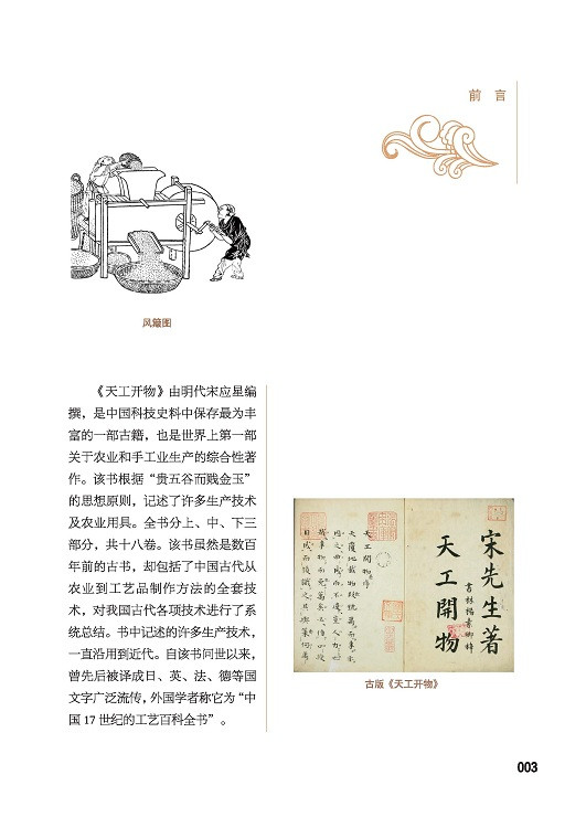 《天工开物》由明代宋应星编撰,是中国科技史料中保存较为丰富的一部古籍,是一部关于农业和手工业生产的综合性著作。该书根据“贵五谷而贱金玉”的思想原则,记述了许多生产技术及农业用具。全书分上、中、下三部分,共十八卷。该书虽然是数百年前的古书,却包括了中国古代从农业到工艺品制作方法的全套技术,对我国古代各项技术进行了系统总结。书中记述的许多生产技术,一直沿用到近代。自该书问世以后,曾先后被译成日、英、法、德等国文字广泛流传,外国学者称它为“中国17 世纪的工艺百科全书”。