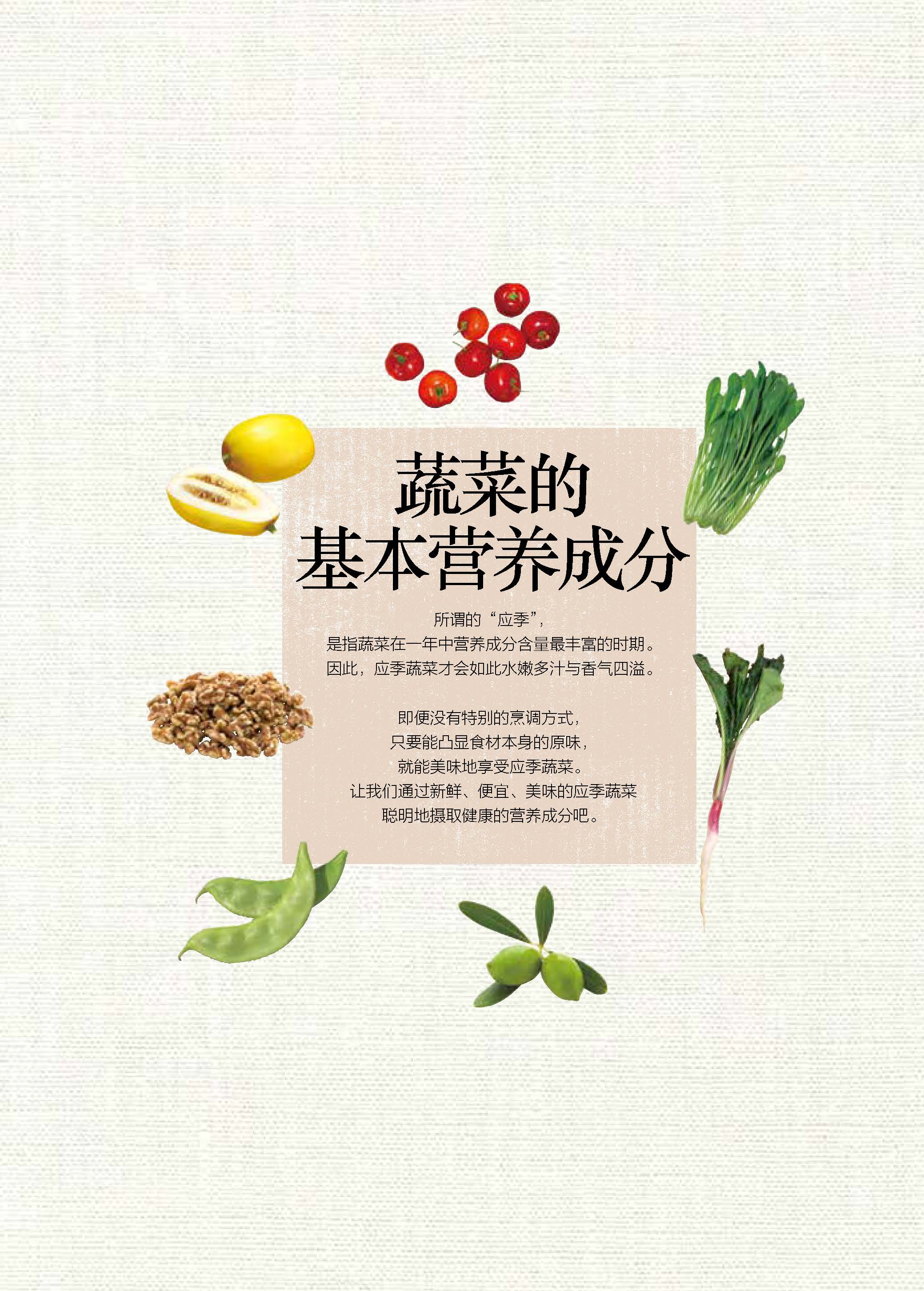 本书将多种蔬菜和常见水果按照四季分类,介绍了不同季节的应季蔬果所含有的主要营养成分、