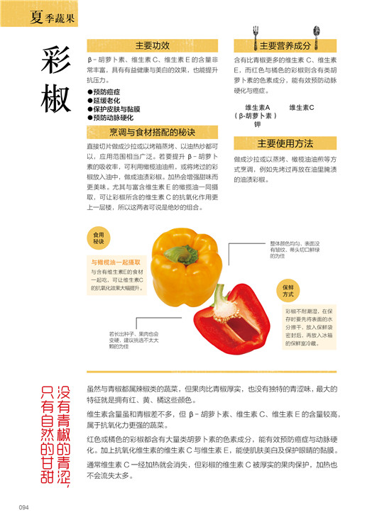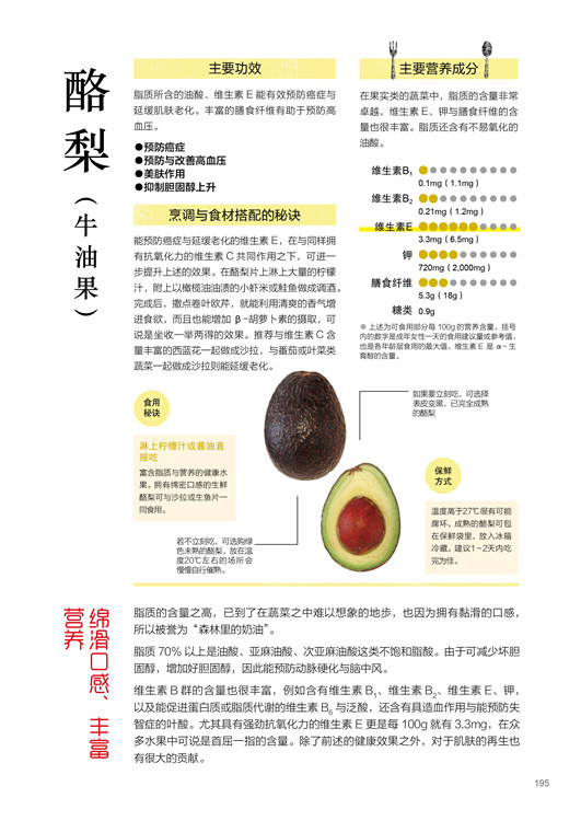 书中每种蔬果都有配图,直观与详细地说明了挑选新鲜蔬果时的注意事项与蔬果不同位置的最佳保存与烹调方式,方便读者阅读与查询。