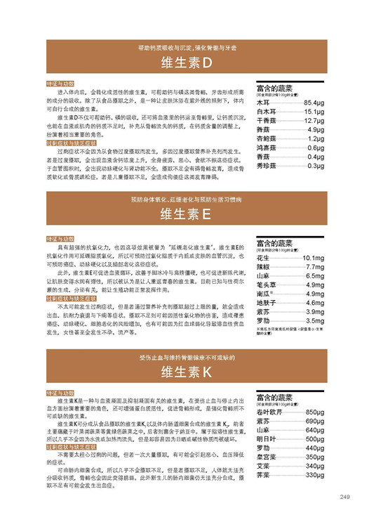 书中最后一章还详细介绍了蔬菜的基本营养成分如蛋白质、膳食纤维、碳水化合物、维生素等的功效,并列举了富含这些营养成分的蔬果与食品,指导读者在身体出现特殊症状如贫血、高血压、