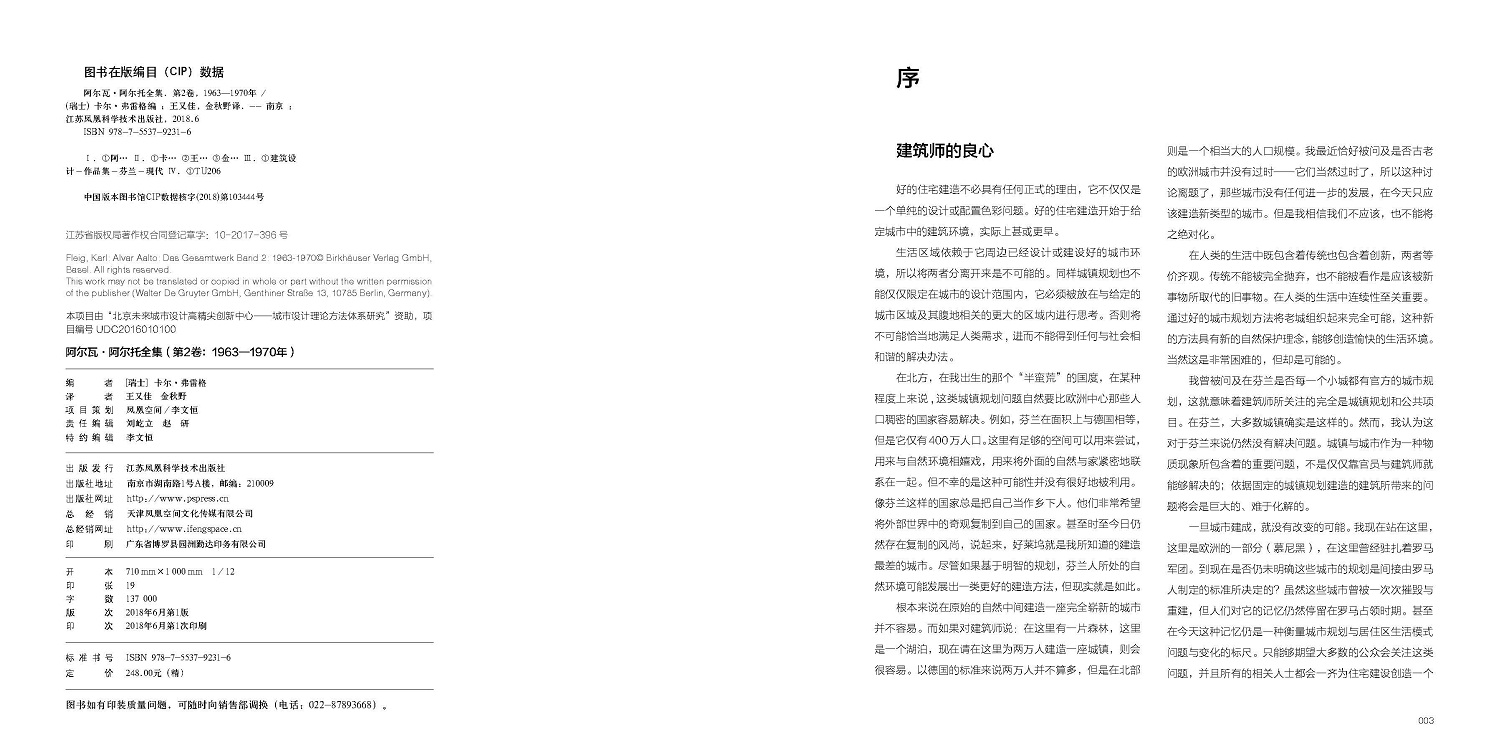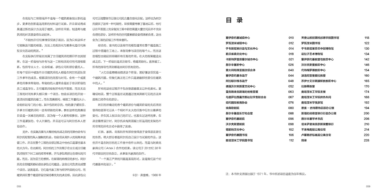 本卷外文原版出版于1971年,是这位大师作品集的第2卷,收录从1963—1970年的建筑设计与规划案例等,包括文化中心、剧院、博物馆、图书馆和教堂等。在这一卷的原著筹备过程中,阿尔托当成是自己的责任,毫无保留地奉献所有。本书没有将阿尔托的建筑设计归类于某种风格或流派,也没有对他的作品小题大做,只是将他的建筑设计忠实、客观、简要地展示与陈述给读者。