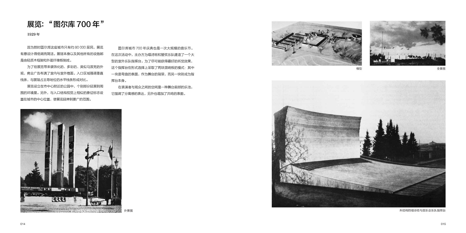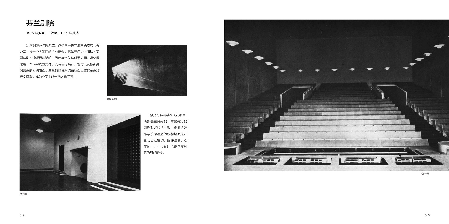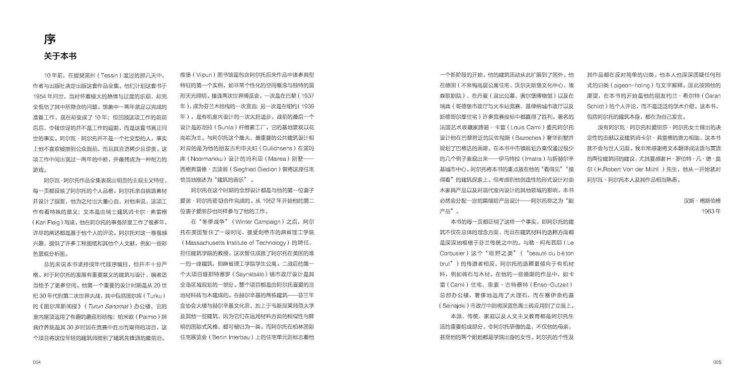 本卷外文原版出版于1963年,是这位大师作品集的第1卷,收录从1922—1962年的建筑设计与规划案例,从1929年建成位于图尔库的芬兰剧院,到1962年的新赫尔辛基城市中心方案,通过280余张照片,近200张设计图纸和草图,按时间顺序为读者展示。本书并没有将阿尔托的建筑设计归类于某种风格或流派,也没有对他的作品小题大做,只是将他的建筑设计忠实、客观、简要地展示与陈述给读者。