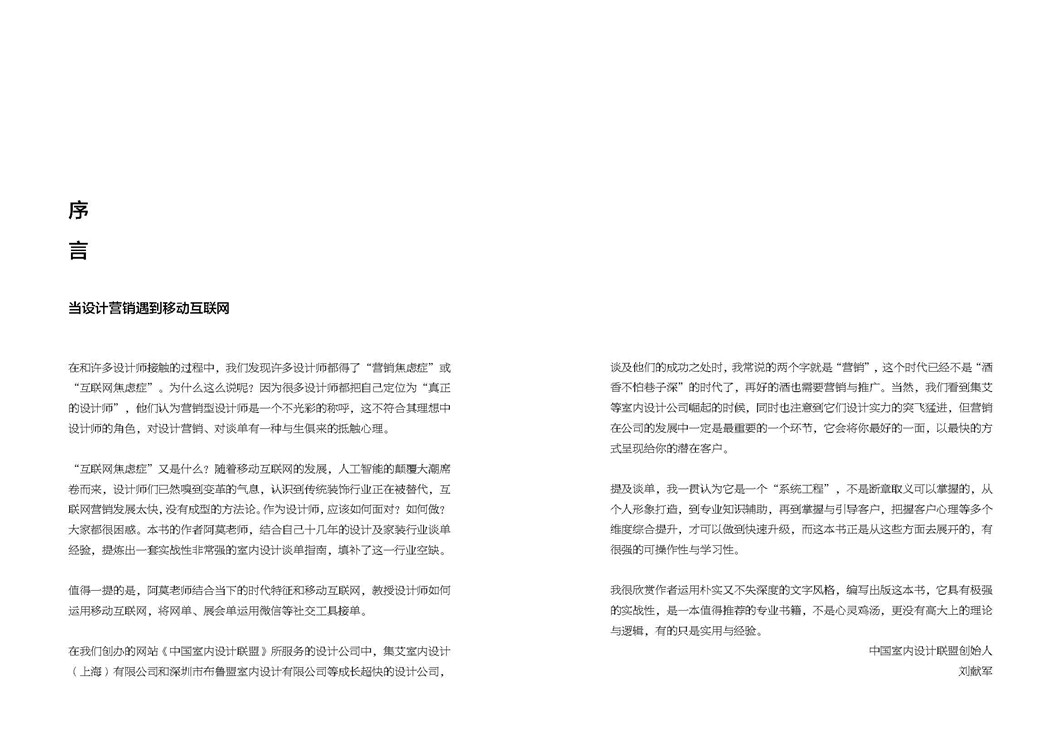 许多刚入行的室内设计师,非常头疼签单的问题,一个月签不了几个单,甚至都不能开张,每月的基本工资难以维持生计,甚至有转行的想法。这本《签单:室内设计师营销必修课》的出版,能有效解决刚入行室内设计师的更多困惑,作者阿莫老师有着十几年室内设计签单经验,书中所述内容实践性很强,描述简单易懂,一学就会。这本书是作者在室内设计联盟网站 “从签单难到签单王的蜕变”公开课的精华版,深度浓缩了作者签单技巧的精华。