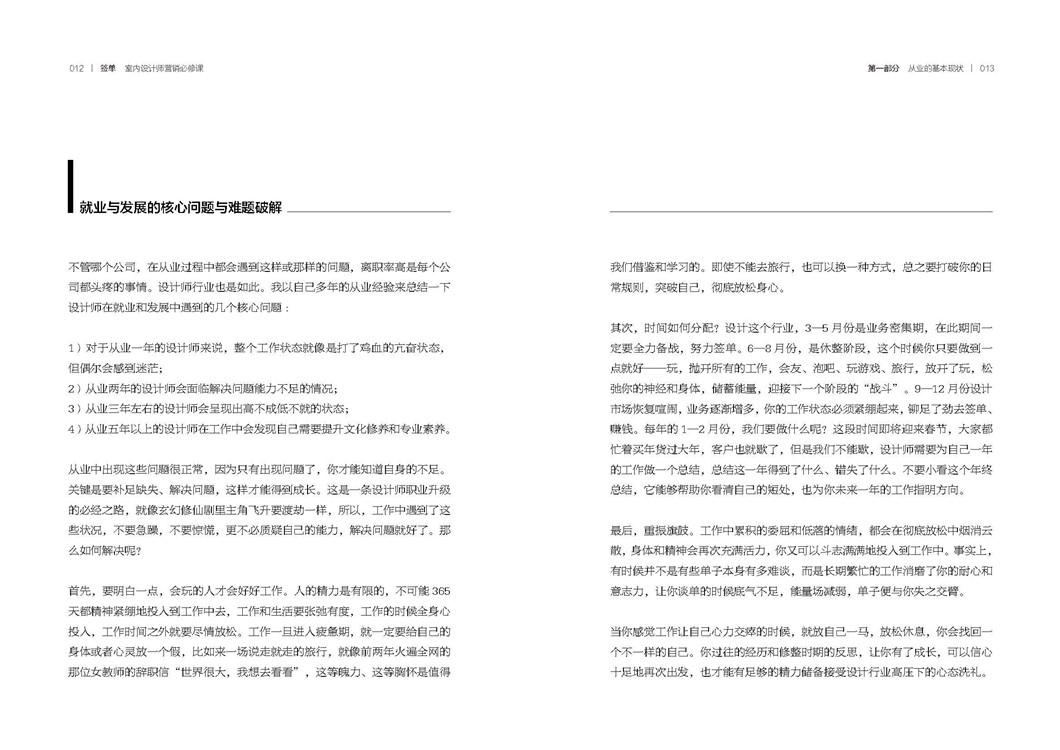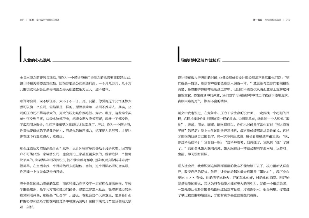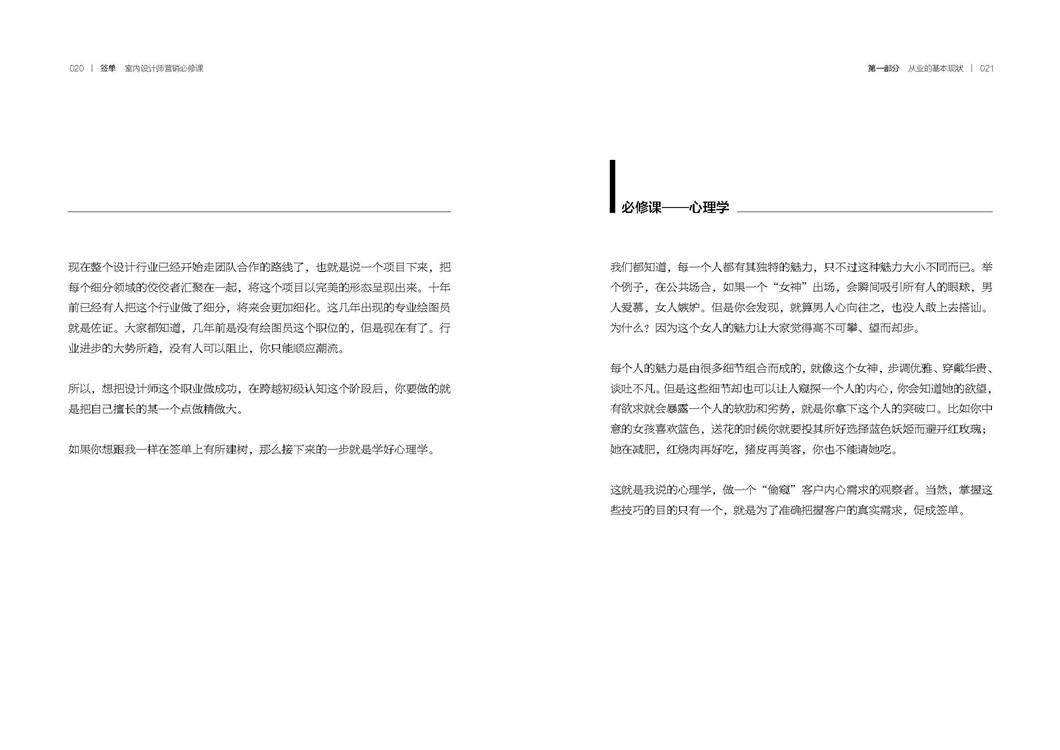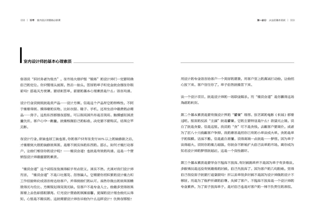 有缘看到这本书的人必定是刚入行的设计师或者已经从业很多年了,但是,我想问大家一句,你们是不是真的搞明白了自己的职业定位?我以前接触的很多在设计公司里工作的设计师,他们无一例外地认为自己是给老板打工的打工者,最多是个高级打工者。在这里,我可以很负责任地告诉大家,这种想法是大错特错的。为什么会这么说?因为你做过的每一个单子都是在为自己打工,而不是为任何人做嫁衣。大家有没有看过电视剧《杜拉拉升职记》?一个什么都不懂的女孩