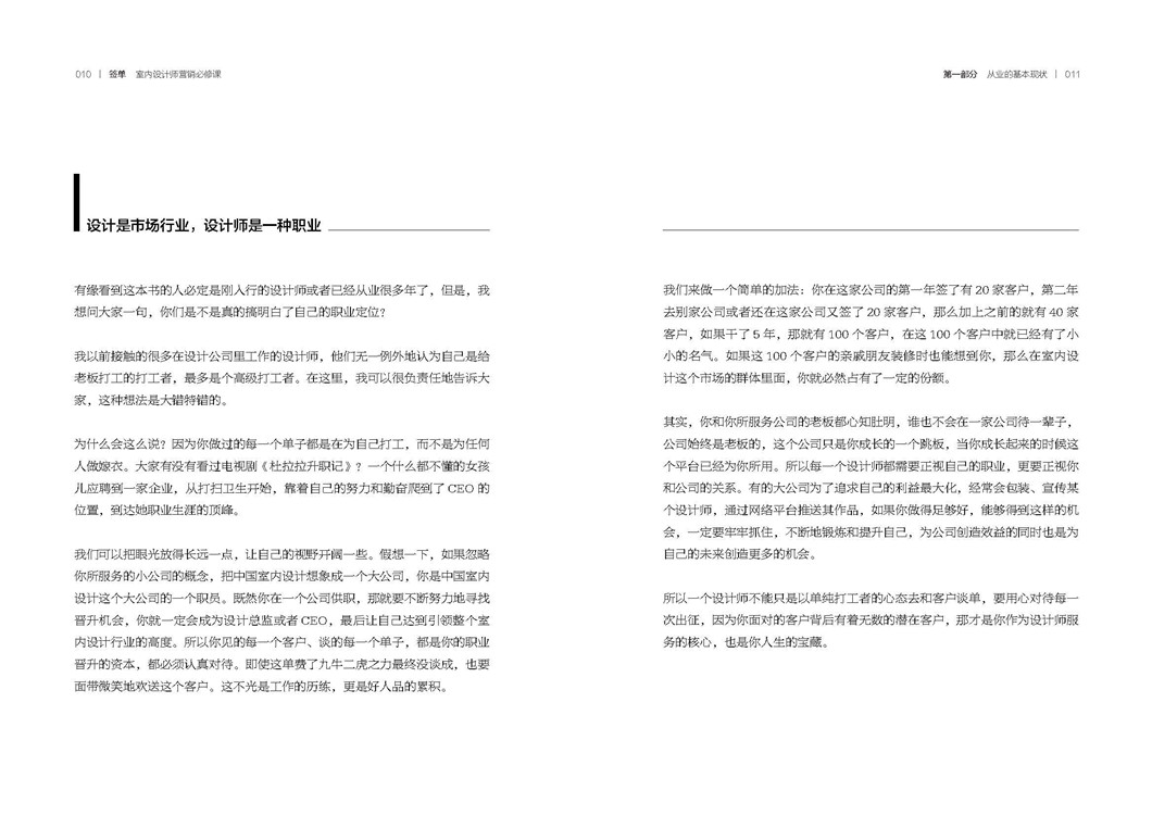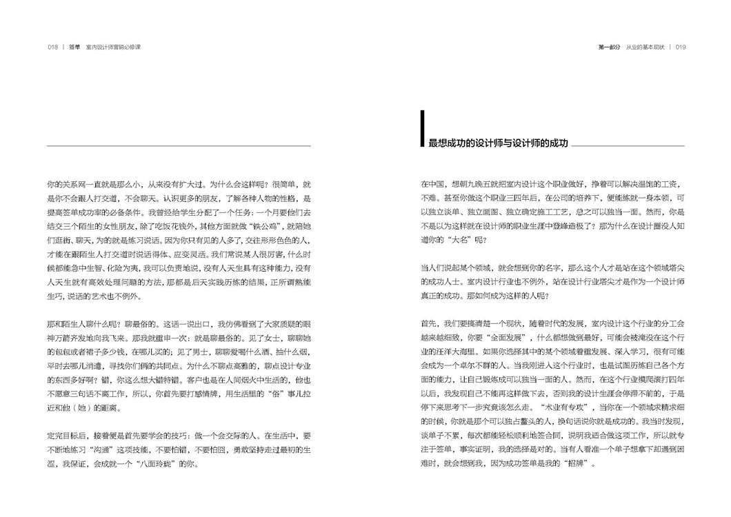 儿应聘到一家企业,从打扫卫生开始,靠着自己的努力和勤奋爬到了CEO 的位置,到达她职业生涯的顶峰。我们可以把眼光放得长远一点,让自己的视野开阔一些。假想一下,如果忽略你所服务的小公司的概念,把中国室内设计想象成一个大公司,你是中国室内设计这个大公司的一个职员。既然你在一个公司供职,那就要不断努力地寻找晋升机会,你就一定会成为设计总监或者CEO,最后让自己达到引领整个室内设计行业的高度。所以你见的每一个客户、谈的每一个单子,都是你的职业晋升的资本,都必须认真对待。即使这单费了九牛二虎之力最终没谈成,也要面带微笑地欢送这个客户。这不光是工作的历练,更是好人品的累积。我们来做一个简单的加法:你在这家公司的第一年签了有20 家客户,第二年去别家公司或者还在这家公司又签了20 家客户,那么加上之前的就有40 家客户,如果干了5 年,那就有100 个客户,在这100 个客户中就已经有了小小的名气。如果这100 个客户的亲戚朋友装修时也能想到你,那么在室内设计这个市场的群体里面,你就必然占有了一定的份额。
