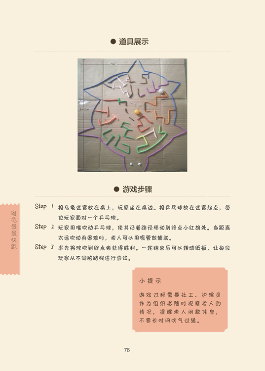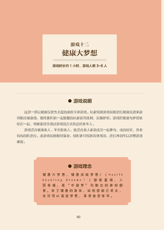 第二部分收录了本届游戏大赛的十二个获奖游戏作品,内容丰富多样。既有动脑的,又有活动健身的;既有一两人进行的,又有团体的;既有三五分钟一局的小游戏,又有近一个小时的较复杂游戏;但共同的特点是简单易行,道具随手可得,一般健康老人均可参加,适当兼顾半失能、失智老人。对于不同难易度的游戏,读者在应用时还可以自己发挥创意加以改造,切实地为老人带去快乐。