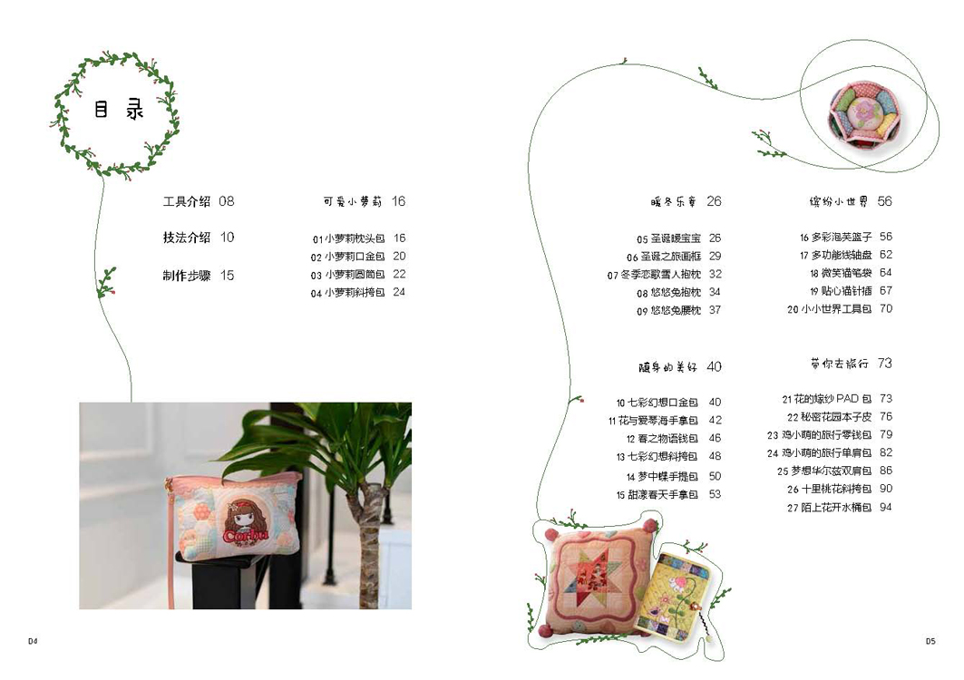 本书分为两大部分,第一部分是拼布的基础知识,包括拼布的工具、技法介绍,以及基础的制作步骤和针法讲解;第二部分是拼布案例教程,根据拼布作品主题和用途的不同分成了可爱小萝莉、暖冬乐章、随身的美好、缤纷小世界和带你去旅行五个小版块,共27个案例。拼布案例汇众包含各种款式和大小的包袋、抱枕以及笔袋、收纳盒和画框等家居小物,简单易做,可行性强,成品既美观又实用。