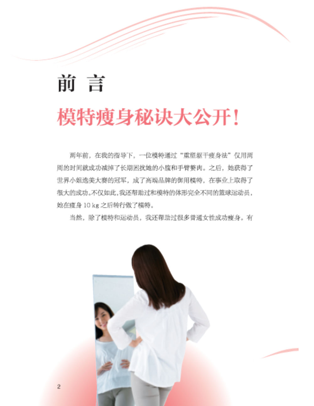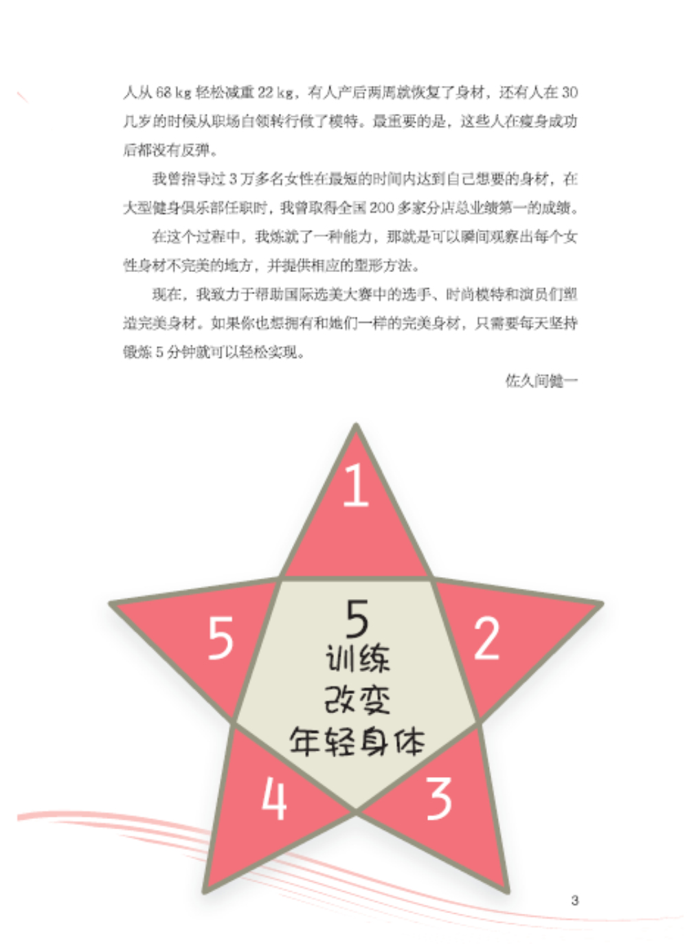 5个动作,坚持两周,不需要挥汗如雨,就能有效解决骨盆前倾、小腹前凸、小腹赘肉、蝴蝶袖等瘦身难题。6大秘诀,帮助读者解答瘦身遇到的各种难题,轻松增加能量消耗,减掉顽固肌肉,养成保持身材的饮食秘诀,让你生活不规律也能瘦身。3大专栏讲解,助你避免瘦身误区,避免越减越胖,科学瘦身。7大妙招助你跨越瘦身的瓶颈期,实现不反弹,塑造完美身材。简单实用,具备极强的可实践性,让看似复杂的瘦身塑形变得一目了然,简单易学,让你轻松实现完美身材。