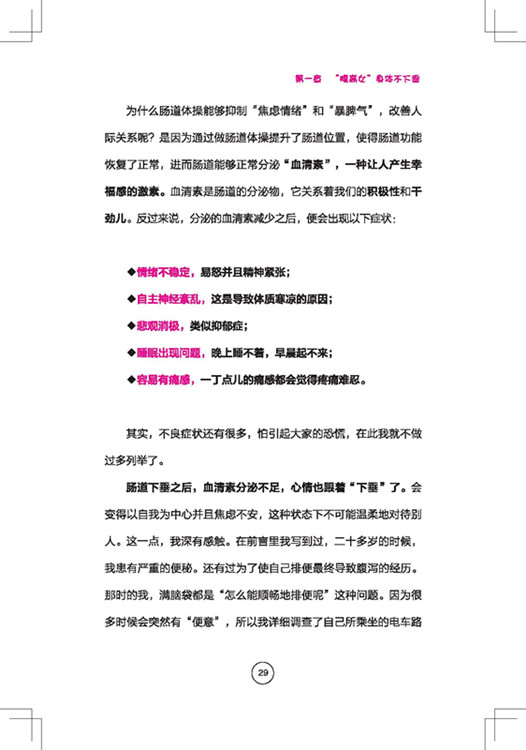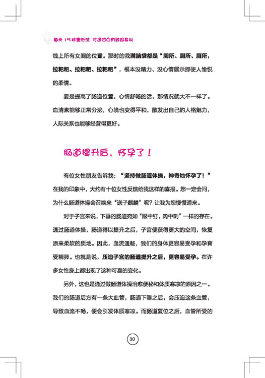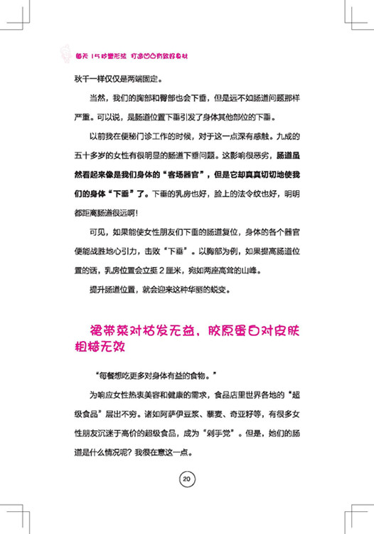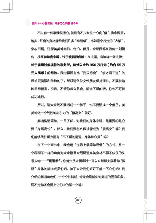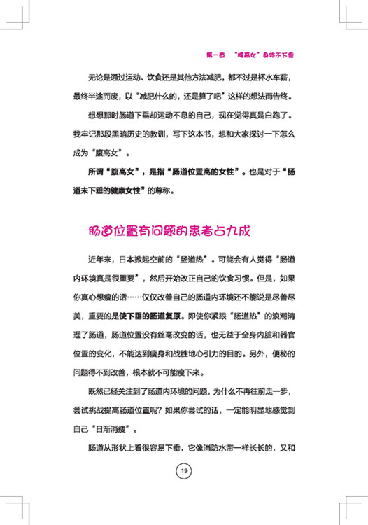 本书以女性身体不断下垂的苦恼开篇,通过分析人体肠道的功能和运作方式,得出肠道决定体重和体型的结论。接着,详细解说作者研发的15秒美肠操,让肠道回到原本的位置。“基础肠道体操”排出体内废物,减轻体重,“局部体操”重塑体型,打造凹凸有致好身材。此外,再搭配使肠道不下垂的生活方式和食物集锦,收获不下垂的生活品质。最后,收录美肠沙龙女子座谈会,东京的模特纷纷感叹改变肠道位置可以改变人生。