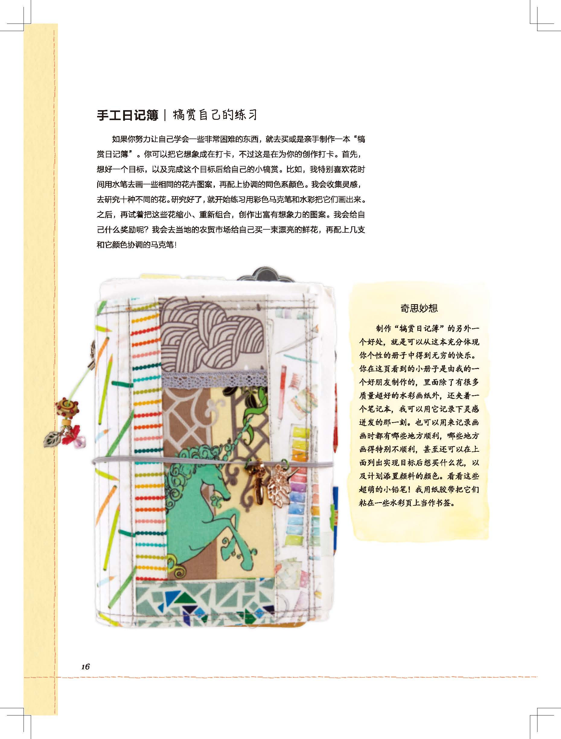 丹妮尔·唐纳森是一位热爱奇思妙想的艺术家,但并不放纵恣肆。你可以在书中感受到她自律又自由的个性。这对初学水彩的爱好者来说实在太棒了!她为我们编著的这本《少女心的水彩日记》值得反复研究玩耍,书中从工具的统筹准备开始,系统讲述了为了不同目标的练习你需要做的事,比如封胶水彩本用于日常练习,创意练习本用于色彩练习……她创造的打卡练习系统最终汇成你在水彩学习之路上的一本本“故事书”。而且让人惊喜的是,丹妮尔会利用拼布,蕾丝,各种小零碎作为创作灵感进行创作,其中的小心思她都毫无保留地告诉了我们。