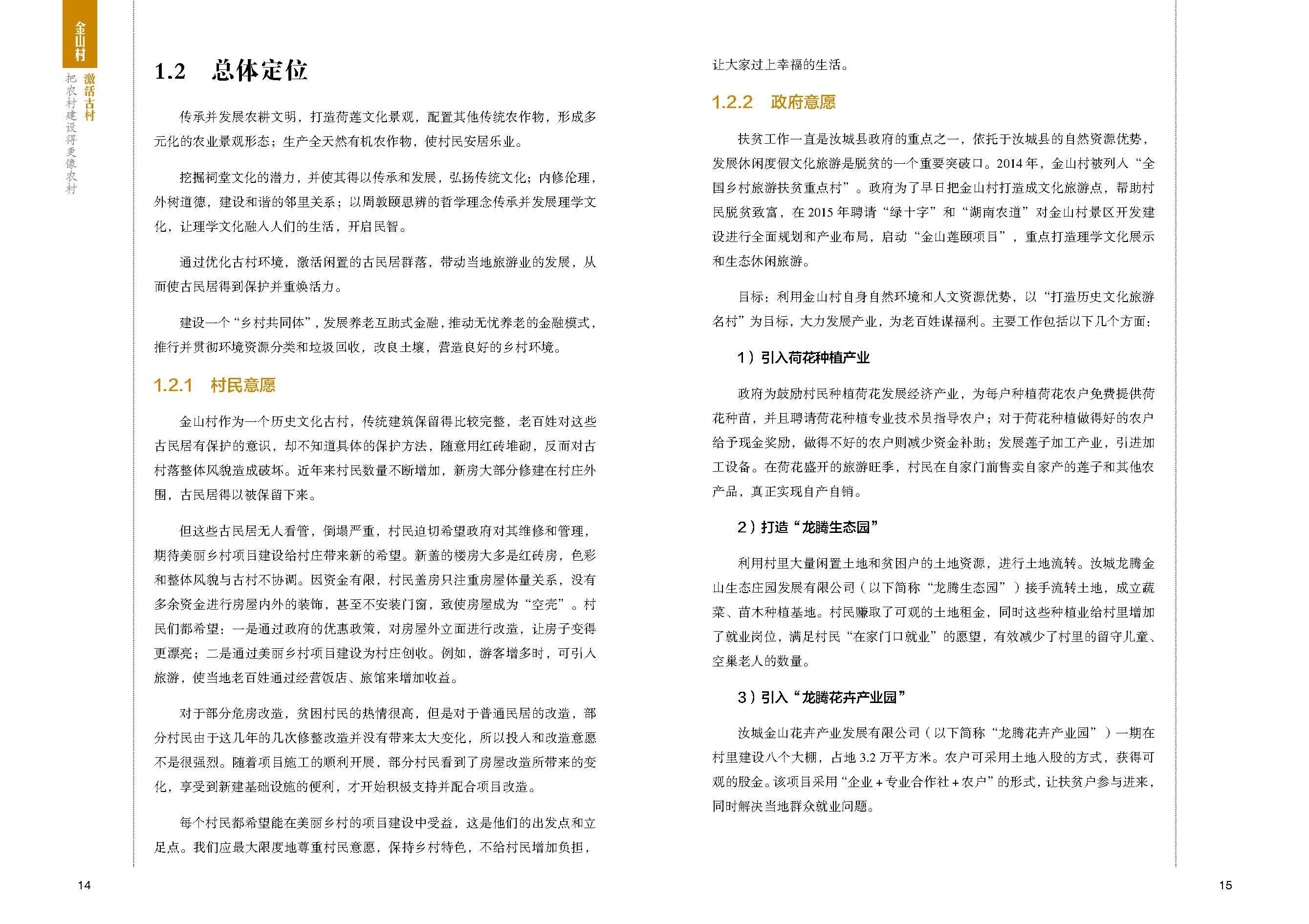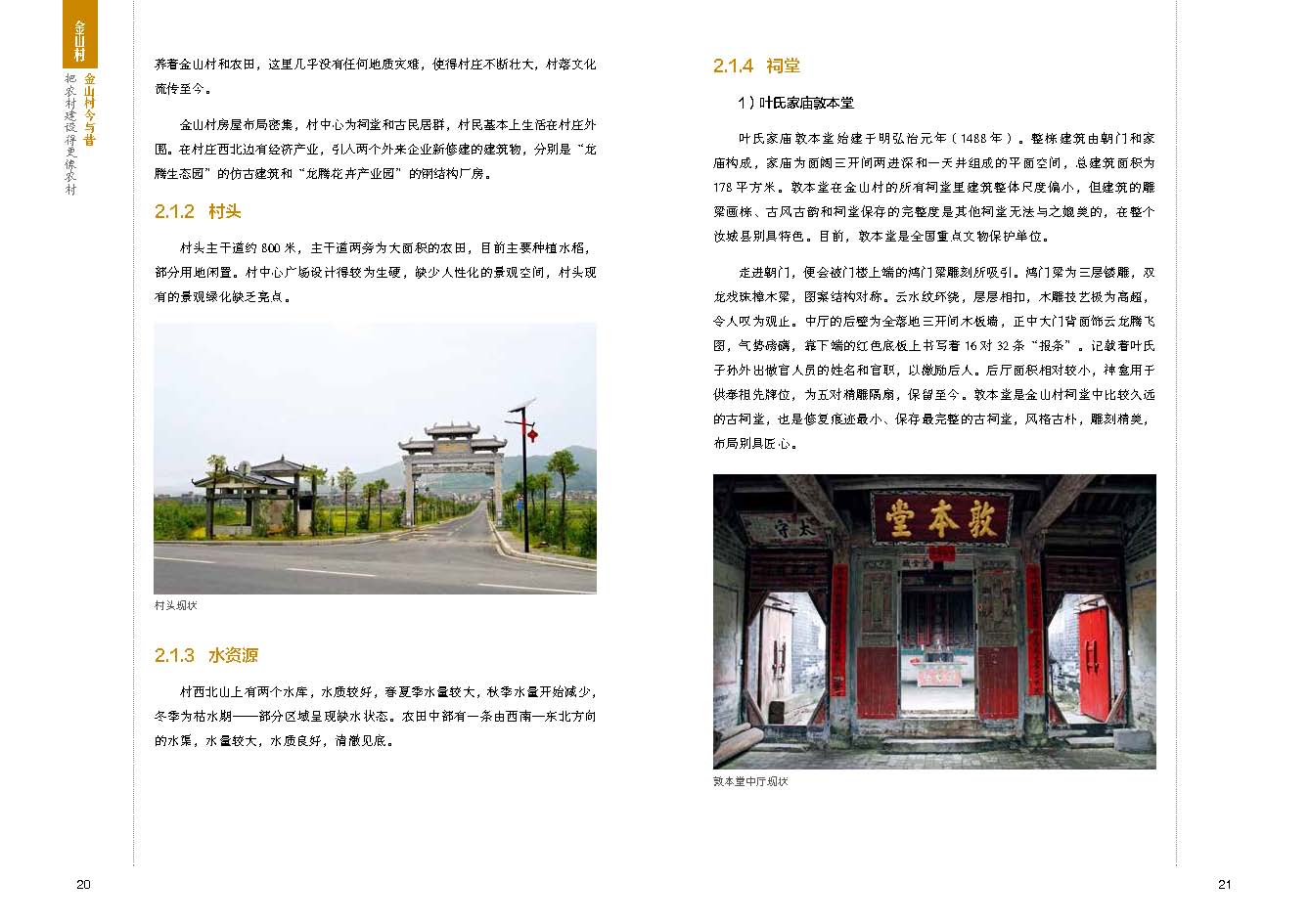 金山村位于湖南省汝城县,是拥有几处国家级和省级祠堂的古村落,有着典型的农村村落特征和祠堂保护的特殊性。设计师从祠堂的修复与保护作为切入点,设计莲花草堂、荷塘景观、村头招呼站、戏台等标志性景观。书中通过实景前后对比图片、设计图纸、模型方案、灯光效果图、手绘图等,让读者不仅能通过文字,还可通过图片来深入了解金山村建设前后的巨大变化。