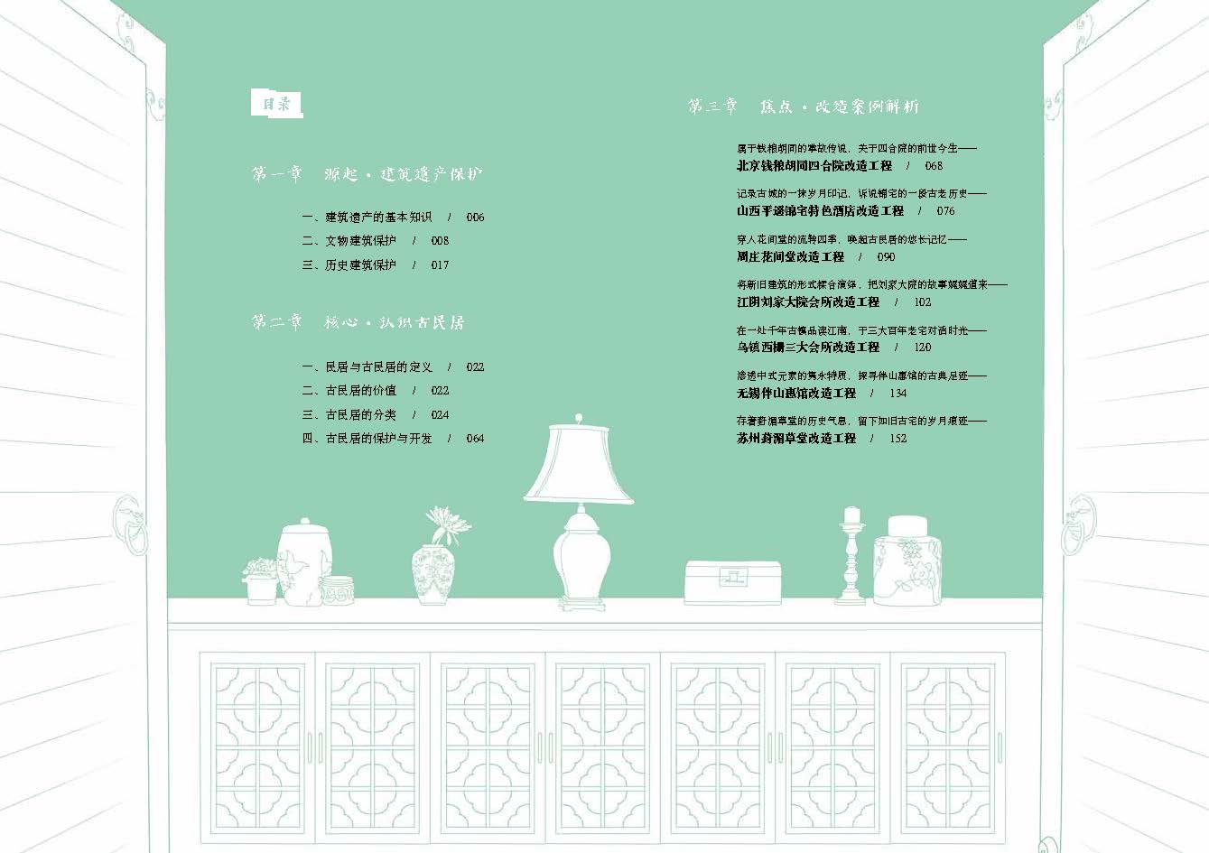 全书共三章,主要从两大部分来阐释古民居改造,一是关于古民居的基本知识,包括古民居的相关概念、保护思想和改造原则等,还简要记录了国内不同地区的古民居之特征,让读者对古民居有大致系统性的认识;二是关于古民居改造实例的解析,选择了七大古老民宅的改造故事,讲述了它们的前世今生,致力于挖掘建筑本身的历史渊源和旧记忆,并结合实际可行的图纸,通过各种保护修复与改造的措施,把它们转变成酒店、会所、民宿等有价值的再利用空间,将旧时光复刻在人们眼前。改造实例中还附有大量的精美实景图,也有各种施工细部的详细讲解,能给予读者带来启发性的思考。