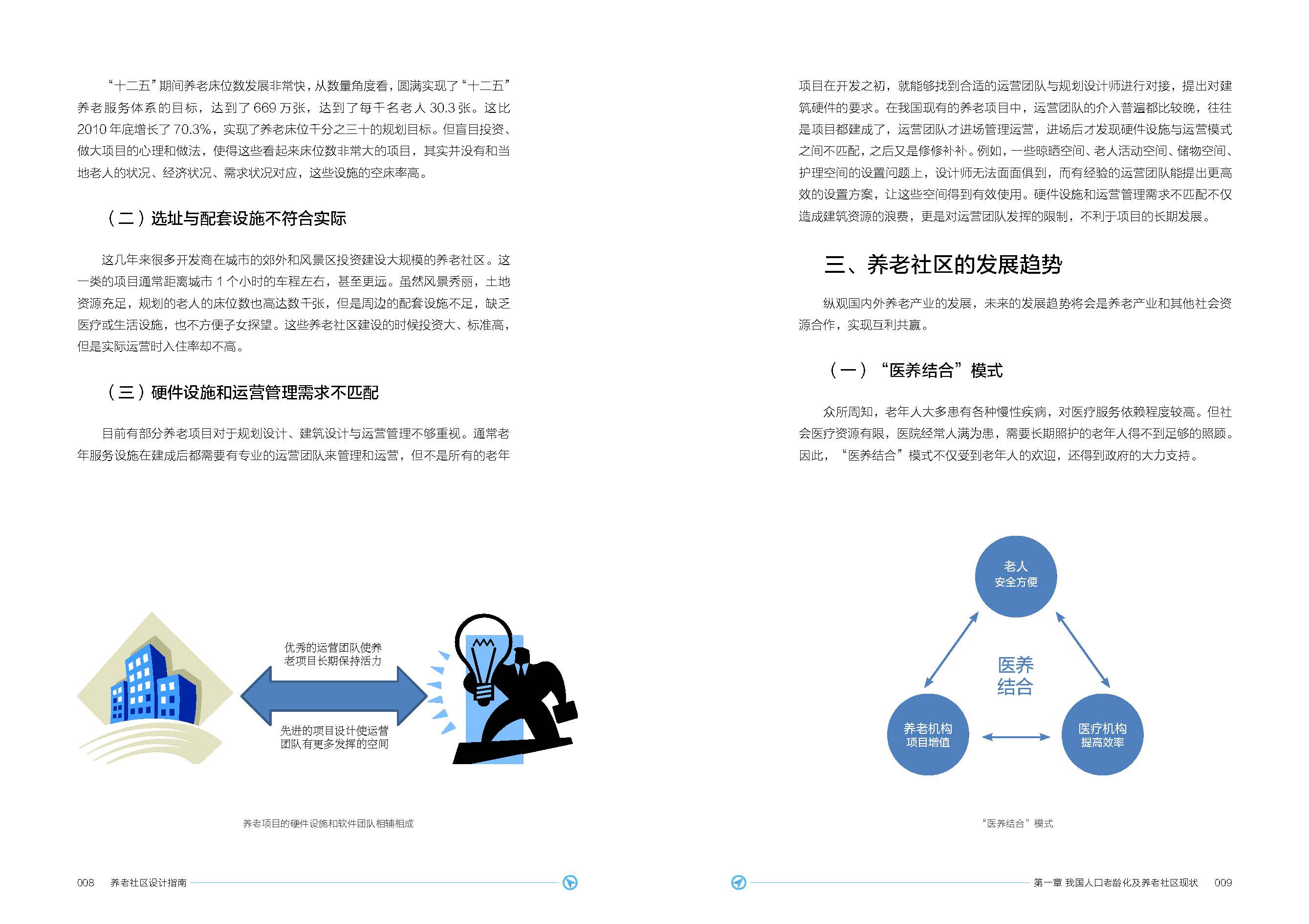 从世界范围看,老年人住宅大致分为社区式照顾老人住宅、机构式照顾老人住宅和居家式照顾老人住宅。社区式照顾老人住宅也称呼为“养老社区”,它主要由政府和非政府组织以及其他机构共同为老年人设立,是集合了居住、餐饮、医疗、娱乐、文化、学习等各种功能的养老场所。