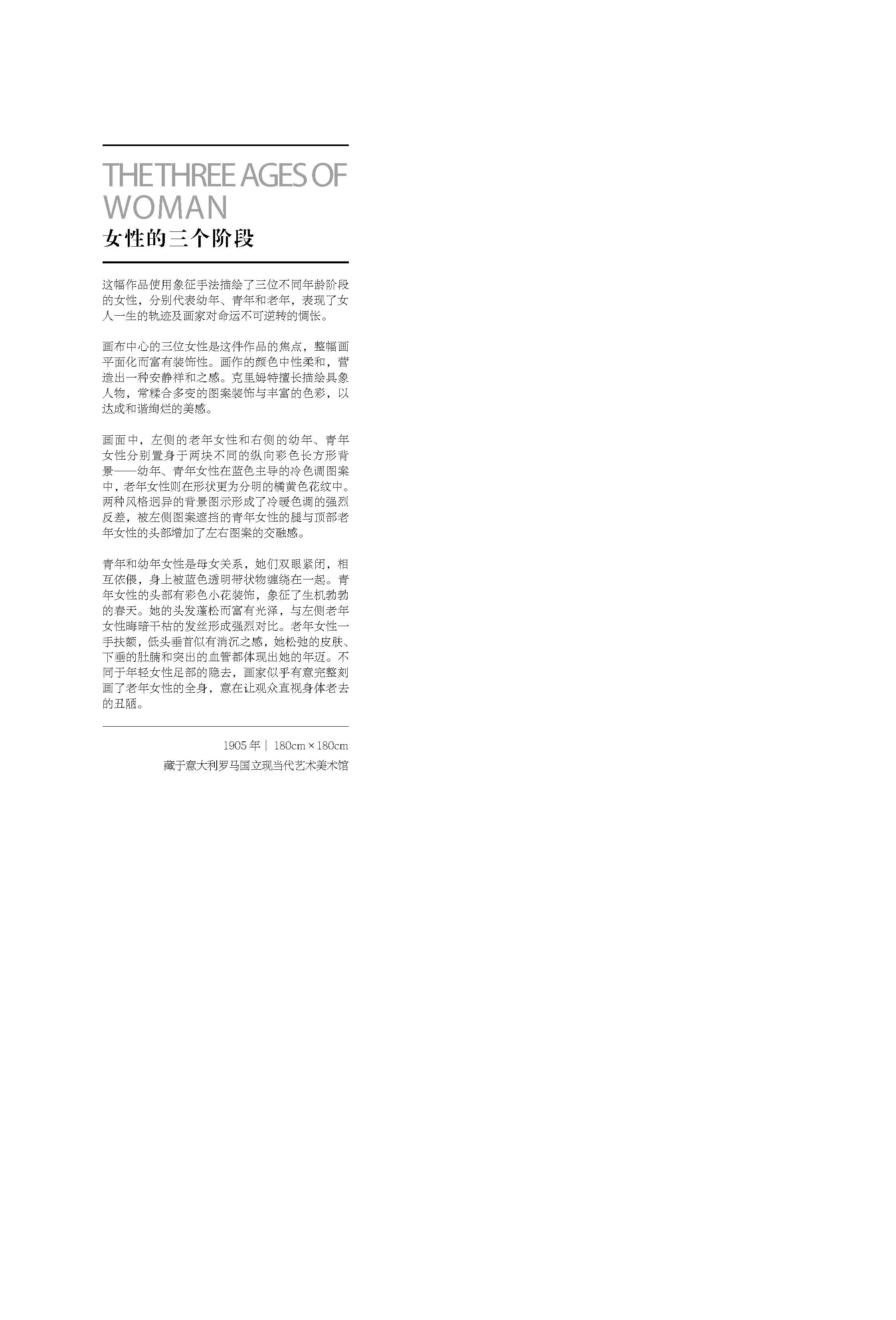这本画册精选克里姆特的《吻》《生命之树》《金鱼》《女人的三个阶段》等32幅著名的油画作品,为拉近读者与大师的距离,本系列所挑选大师作品力求经典。作品选择内容丰富、题材健康、色调明快、色块清晰。从而达到受众人群广,从学生到美术爱好者,甚至美术培训机构,包括成人和儿童。装帧形式更便于临摹学习和室内空间装饰,用途广泛。精美的封盒设计、考究的用纸以及高品质、高清的印刷也为提升本系列画帖的品质的必要条件。