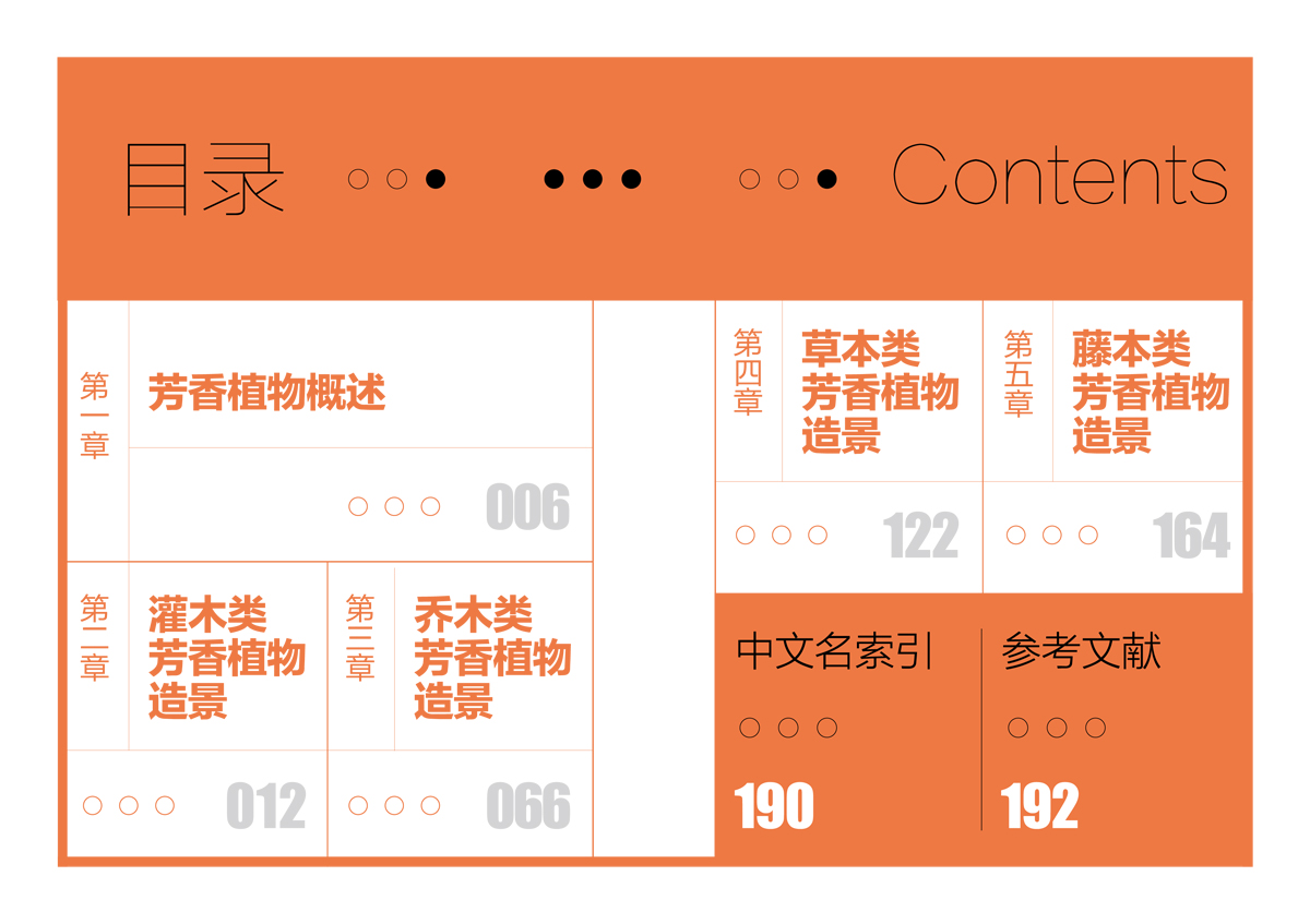 《芳香植物景观》按植物的特性和景观功能分类,分为灌木类芳香植物造景、乔木类芳香植物造景、草本类芳香植物造景、藤本类芳香植物造景,方便园林从业人员在实际应用中参考借鉴。