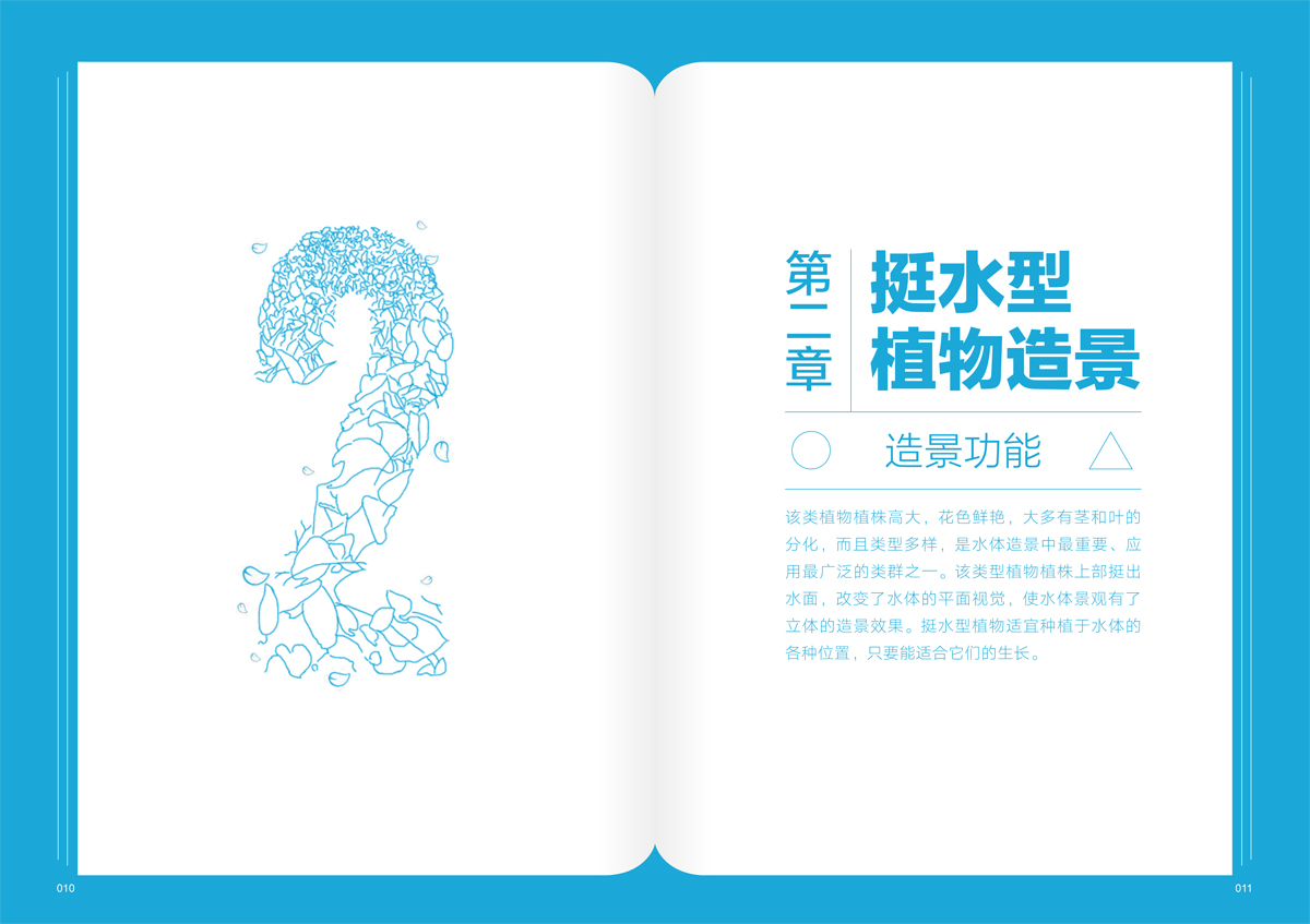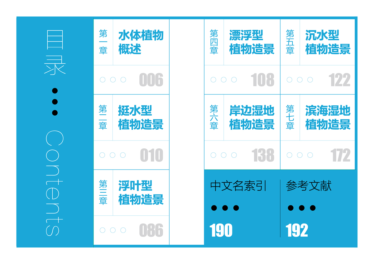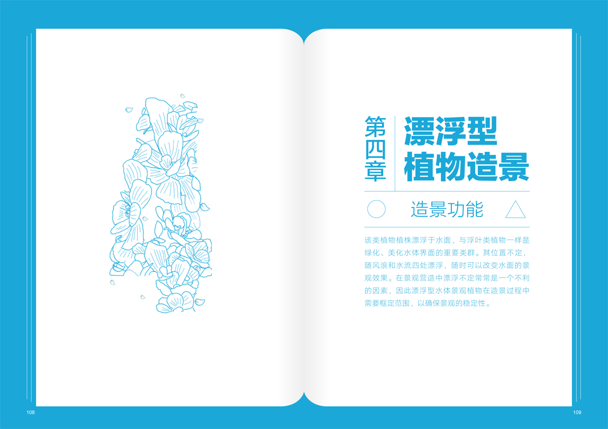 《水体植物景观》按照植物的特性和景观功能分类,分为挺水型植物造景、浮叶型植物造景、漂浮型植物造景、沉水型植物造景、岸边湿地植物造景、滨海湿地植物造景,方便园林从业人员在实际应用中参考借鉴。