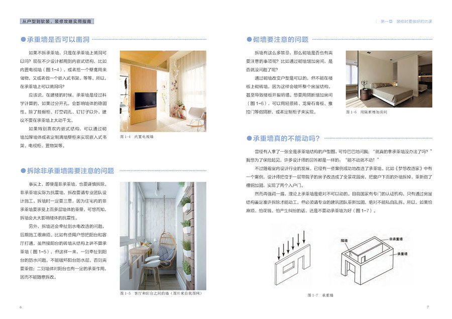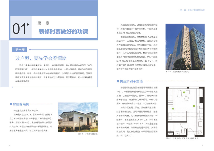 本书分为四部分:第一章为“装修时要做好的功课”,主要讲装修时有哪些地方需要注意,着重于细节;第二章为“空间的妙手安排”,从卧室、客厅、玄关、厨房、卫生间、阳台等分区入手,分别讲解各功能区的一些装修要点和建议;第三章为“懂一点配色和风格,提升家的品味”,主要从风格和配色入手,讲解各种风格的注意事项;第四章为“要住得舒适,从器具下功夫”,主要讲述有哪些实用好看的家具、部件,以及个别家具有哪些地方不尽如人意,需要谨慎购买。