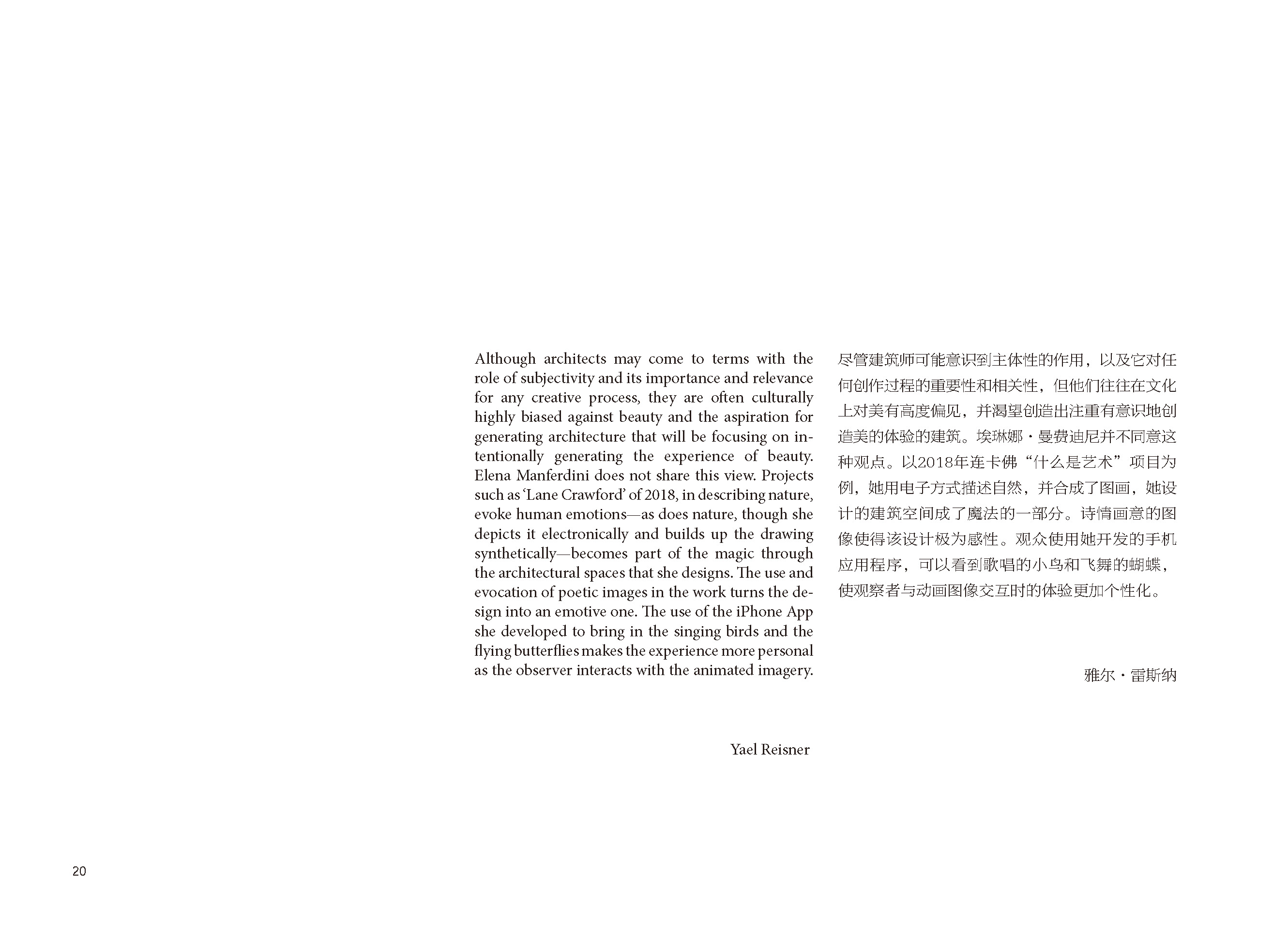 本书收集了埃琳娜近6年的参数化设计成果,分为“水平”与“竖直”两册出版,前者是“图片”,后者是“图纸”,两者都基于数字技术产生。前者是“通过3D扫描采集的自然元素,如植物群和动物群,初始状态是三维数字点云,将它们进行处理形成这些图片”,呈现出崭新的充满触感的合成环境;后者是“通过编写代码生成的图形,没有一张像通常建筑图一样是从三维到二维平面的减法过程获得的结果,它们就像按比例缩小的建筑物再现”。这是埃琳娜对数字技术与建筑设计相结合这一问题进行独特而深度思考的结果,它让我们重新审视在数字技术条件下建筑设计的“表现”方法与理论。我想无论西方学者还是中国学者都一定会对这本书产生强烈的反响。