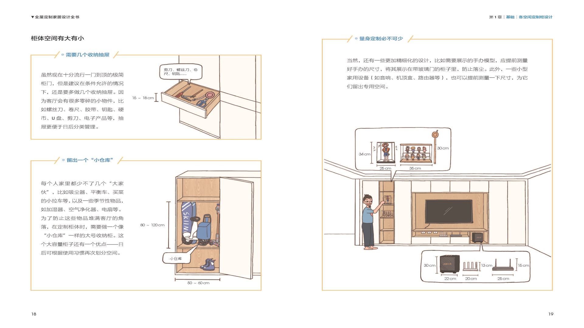 特别收录家居生活用品尺寸图鉴——生活日用品尺寸全览,符合人体工程学的定制柜尺寸大公开:玄关柜进深、吊柜和地柜的舒适高度,以及衣柜第一层搁板的高度等,全干货完全呈现。