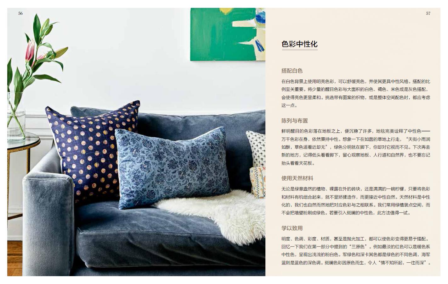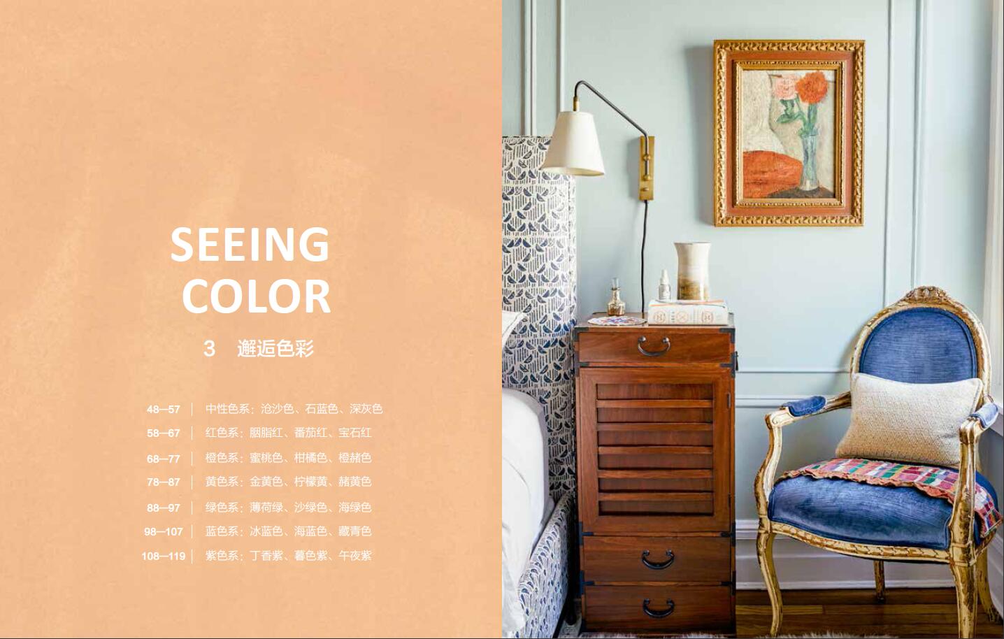 本书理论部分讲述了色彩基础知识和常用的搭配法则与技巧,以7大色系为例,尤其将中性色作为一大色系重点介绍。案例部分精选美国设计师的12个家居案例,进行展示与分析,配以200余幅高清实景图,为读者提供家居设计的灵感与启发。