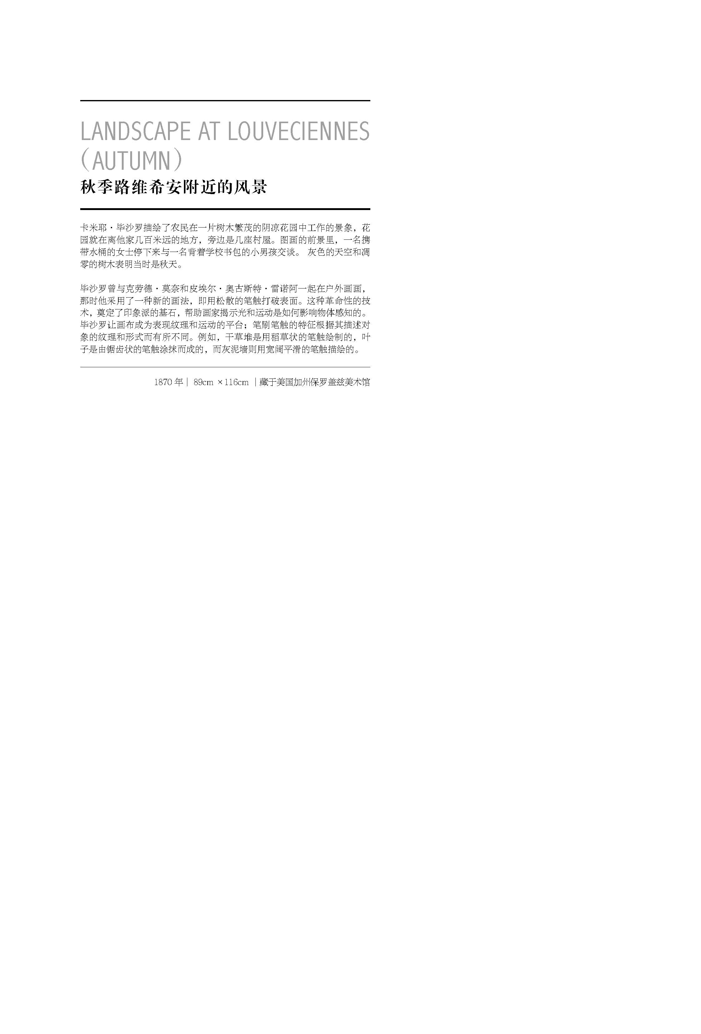本册艺术家为卡米耶•毕沙罗,精选《红屋顶》《收获》《蒙马特大道的多云早晨》等32幅作品,为拉近读者与大师的距离,本系列所挑选大师作品力求经典。作品选择内容丰富、题材健康、色调明快、色块清晰。从而达到受众人群广,从学生到美术爱好者,甚至美术培训机构,包括成人和儿童。装帧形式更便于临摹学习和室内空间装饰,用途广泛。精美的封盒设计、考究的用纸以及高品质、高清的印刷也为提升本系列画帖的品质的必要条件。