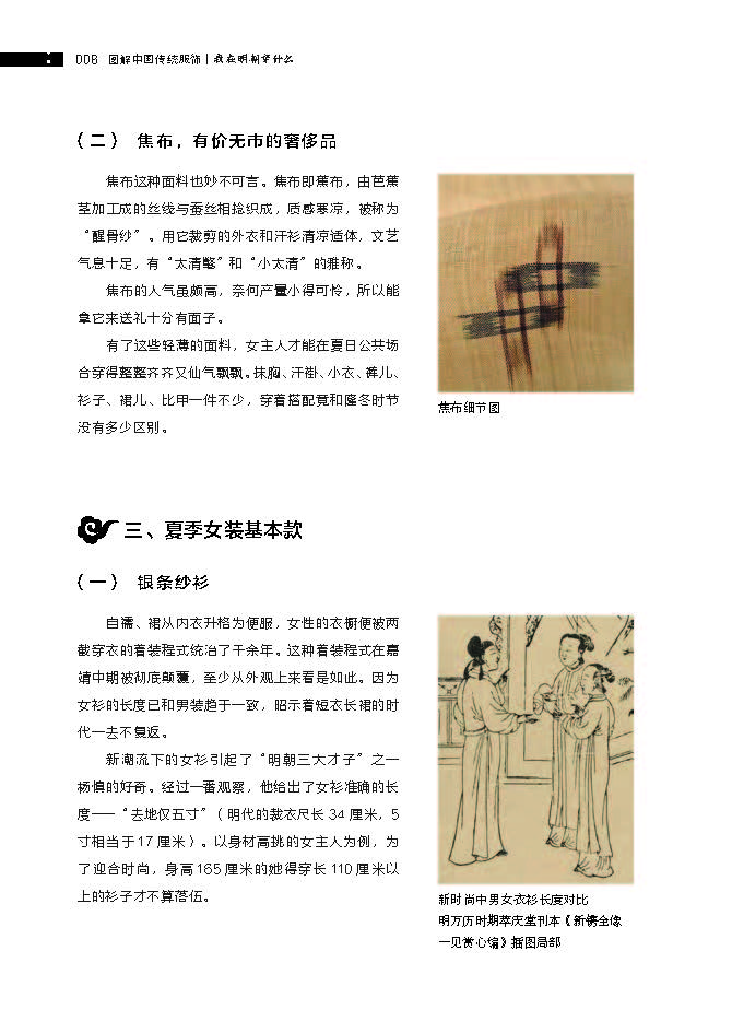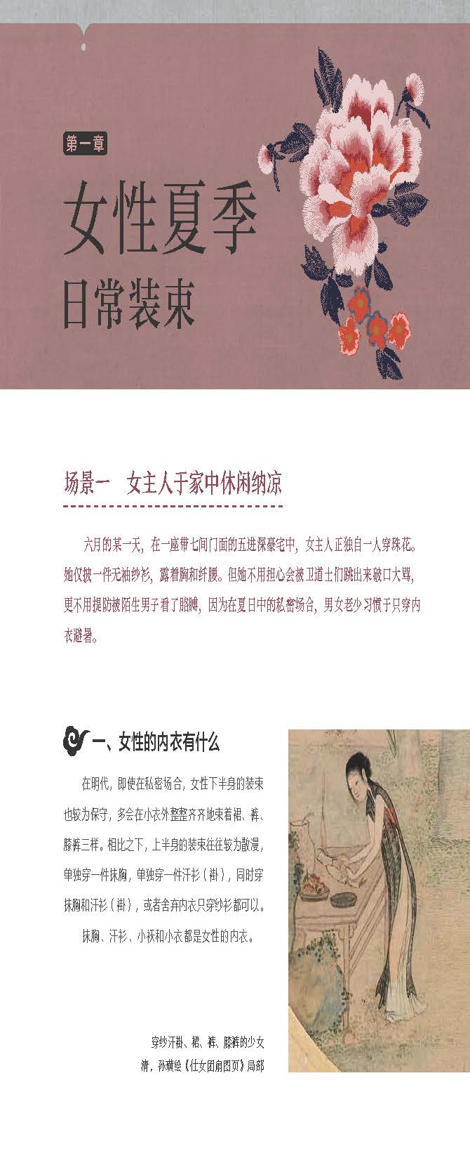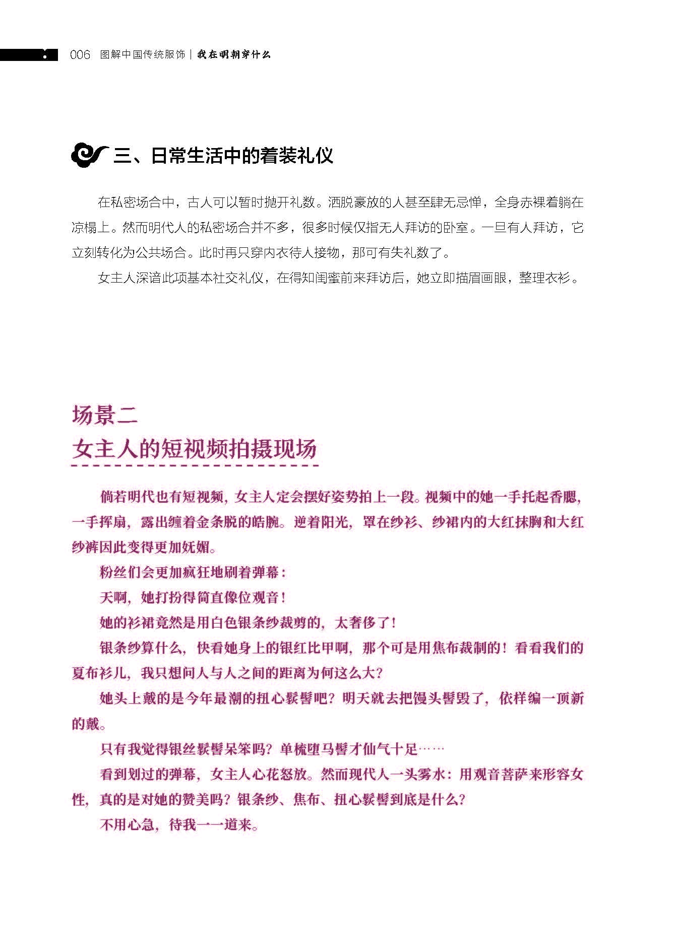 本书以有趣的场景代入式写法,向读者栩栩如生地展示了明代人的着装与饰品。全书通过12章30个场景300多幅手绘图及古画中的服饰介绍了明代女性夏季着装、男性着装礼仪、不同身份人正式拜访时应穿的礼衣、出席不同规格宴会时的装束、婚丧嫁娶时人们的着装、节日庆典时的应景服饰、朝服的组成和穿着顺序、时尚流行服饰的传播、户外运动装、旅游休闲装等。通过对服饰解剖式的介绍不仅可以更好地了解古人的智慧与审美,还能为现代汉服的设计与穿搭、传统文化的溯源与发扬起到借鉴的作用。