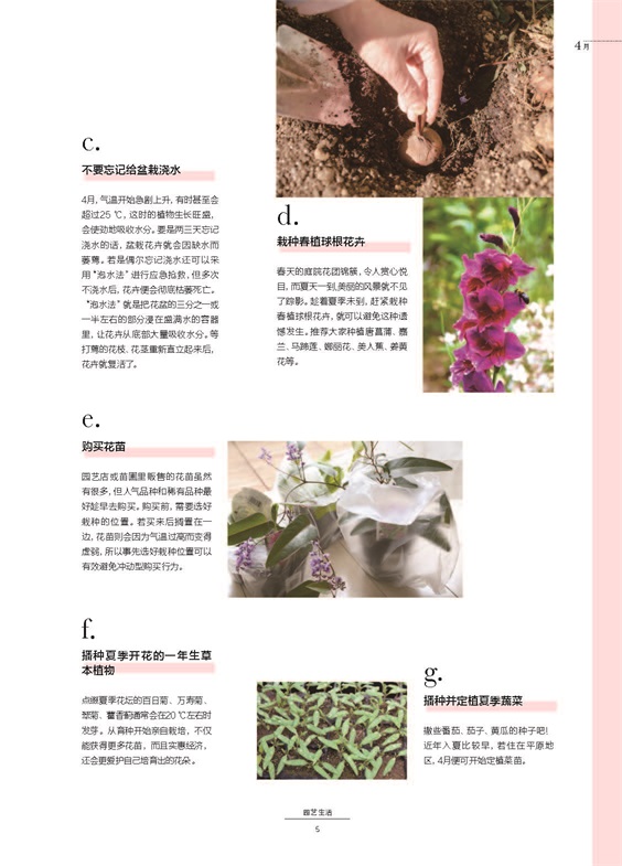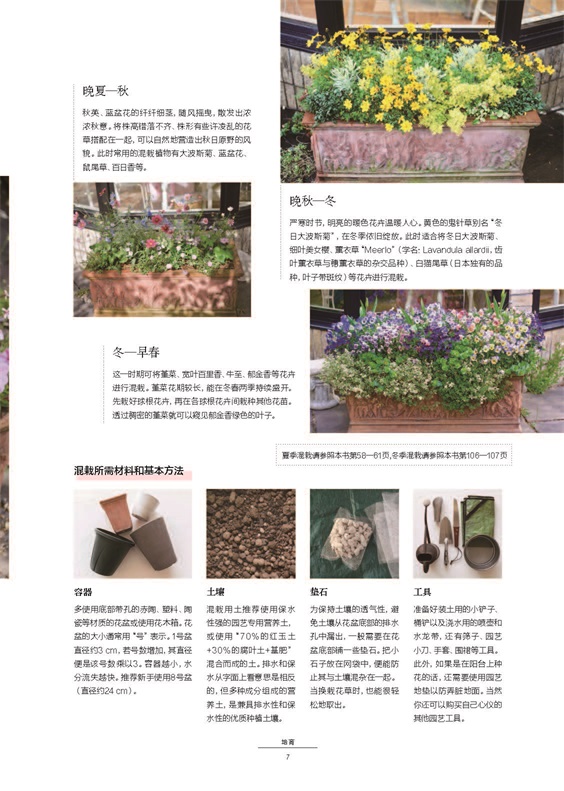 本书按照月份分为12个章节,涵盖了每月易栽植物推荐、植物养护、庭院景观设计、植物配色等方面的内容。此外本书还加入了培育、装饰、料理三个主题,希望大家将园艺活动的成果从户外带入室内,过上花草为伴的诗意生活。每章开篇部分推荐了当月花期的十多种植物,介绍了植物的花期、栽培方式、科属等基本信息;随后的部分按步骤细致讲解了每月需要进行的园艺活动,如果换盆翻土堆肥的技巧或者庭院景观设计和植物搭配的小妙招;第三节以某一类代表性植物的培育要点为主要内容,例如香草类植物的栽培和养护、球根类植物的培育技巧等;第四节教读者将植物运用到生活中,如各式花卉的插花花束制作、香料助眠枕的缝制等;第五节希望读者在劳动之余也能有口福之享,介绍了多种可以用自己庭院植物制作的菜肴或茶饮。本书结尾处,编者贴心总结的园艺生活日历可以帮助大家合理有序地开展园艺活动。
