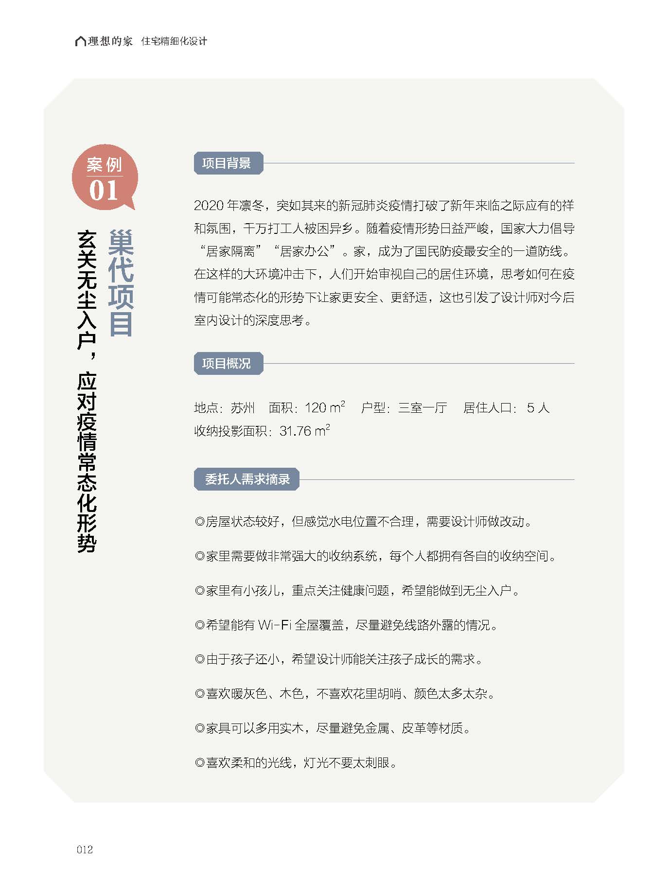 书中将具有代表性的 13 个案例,分别从功能空间、户型结构、客户多样化需求、功能与设计交互四个方面进行系统解读。每个案例既介绍了项目背景、客户需求,又阐明了整体设计思路,有方法论,有人情味,有对未来居所的构想,有落地实践的细节,深入浅出地呈现了室内设计的内涵与外延,相信一定可以为装修设计者、从业者们提供诸多灵感。