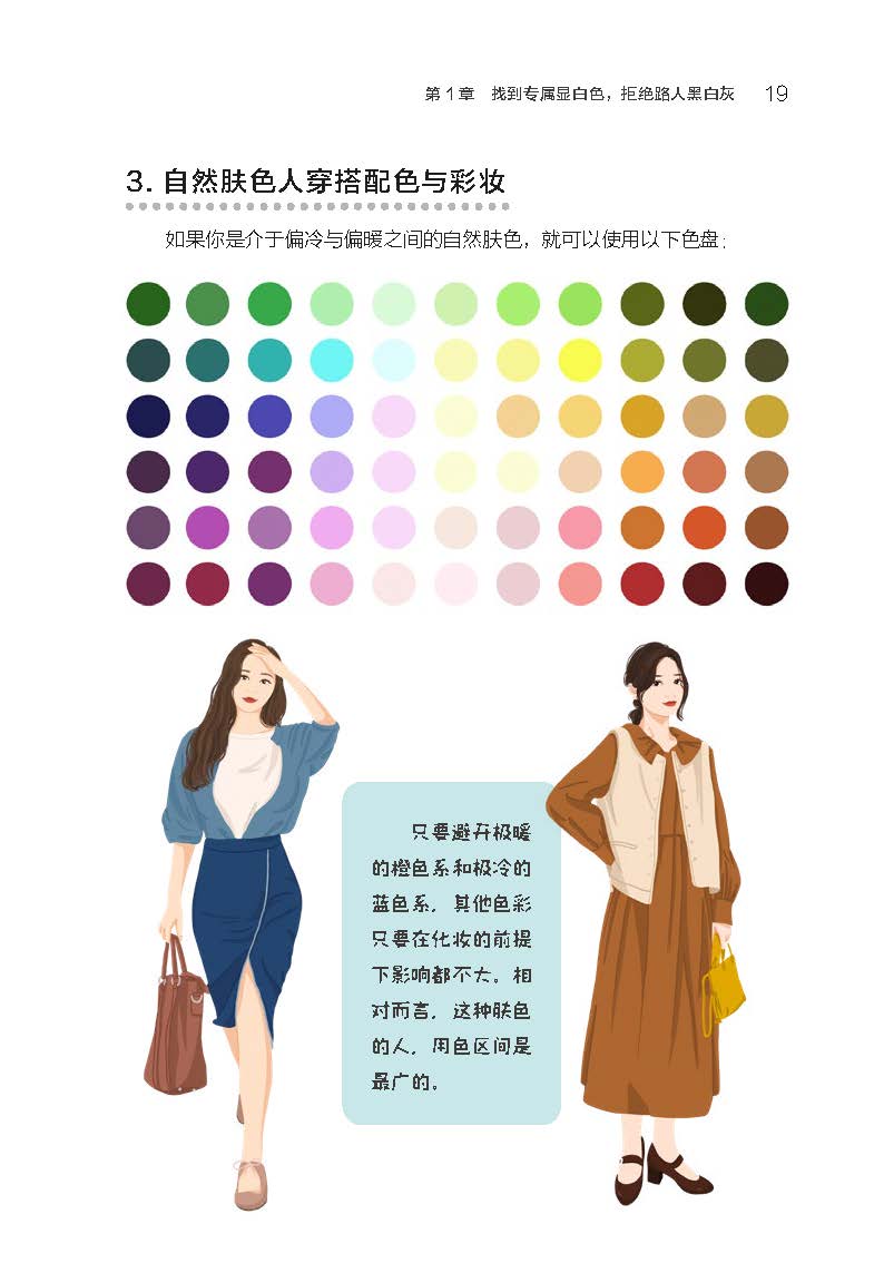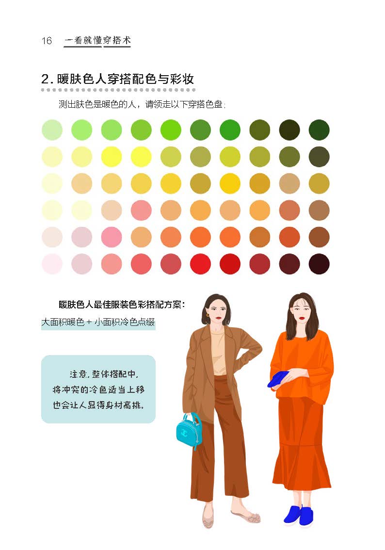 书中开篇是穿搭的基础,即了解自己的肤色,冷暖肤色在服装及彩妆色彩的选择上大有不同。第二章到第五章进入主题,详细讲述穿搭配色、技巧与风格。无论是在自然、名画中找灵感,还是介绍穿搭的节奏感,或是如何通过服饰弥补身材的不足,都能让你一看就懂,一学就会。第三部分介绍了发型和配饰应该如何选择,为你打造出彩的形象。