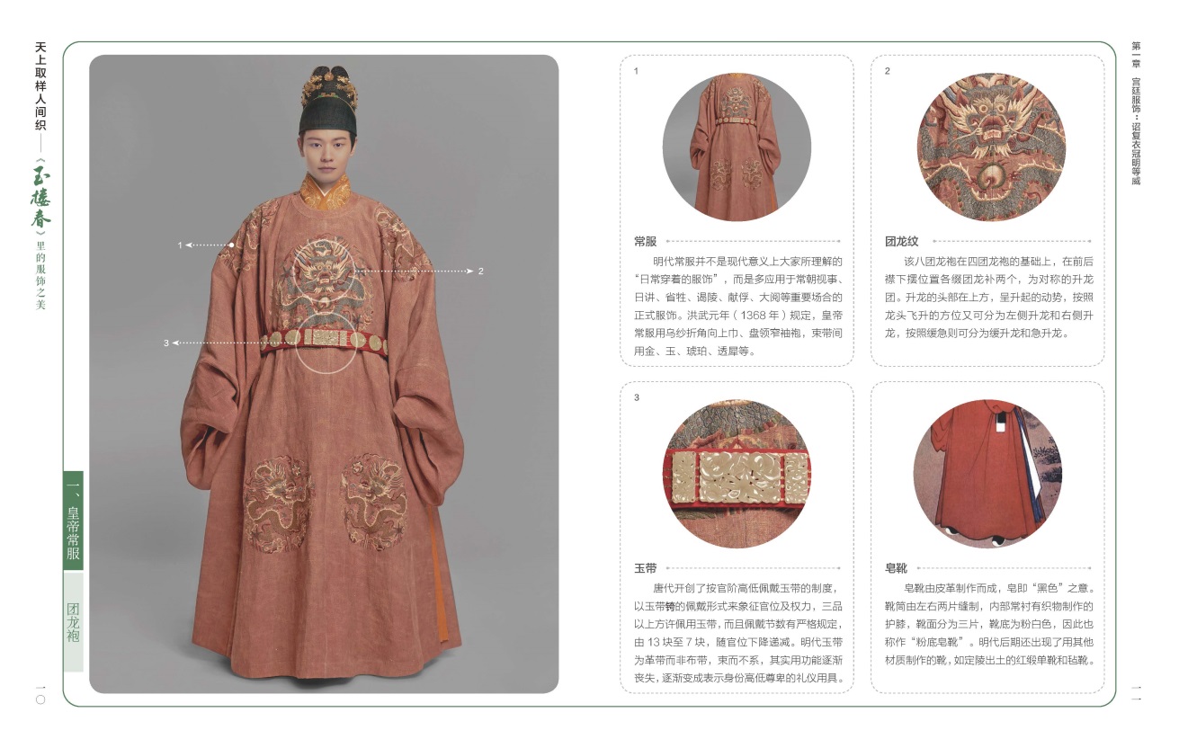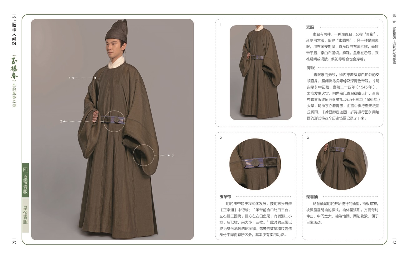 《天上取样人间织——<玉楼春>里的服饰之美》主要以热播影视剧《玉楼春》中的服饰为素材,梳理展示了包括剧中的近70种服装,以及各种不同款式的衣冠、饰品等。书中图片选取的定妆照服饰,包括皇帝常服、皇后礼服、士庶男子服饰、妇女便服、军戎服饰等,配以易读而不失专业的文字,详细解释不同服饰背后蕴含的文化。作者团队用简明易懂的语言,穿插我国古代服饰的基本知识,将多种服饰的特色和典故娓娓道来,同时介绍了刺绣、缂丝等“非遗”传统手艺。书中选取图片精美,文字优美,抒发了作者团队对中国服饰文化的礼赞。