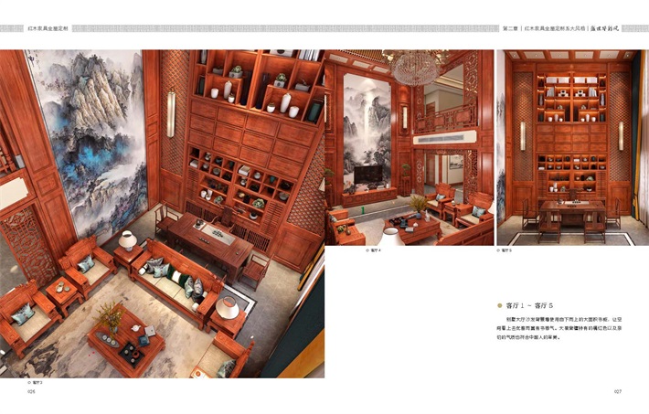 书中风格涵盖5大风格,既有豪华大气的也有简约飘逸的,既有古色古香的也有现代中式时尚的,木制作的表现上集中了当今常用的各种红木类材质,能通过各种木色体现空间氛围,方便业主确定自己想要定制的风格。