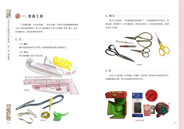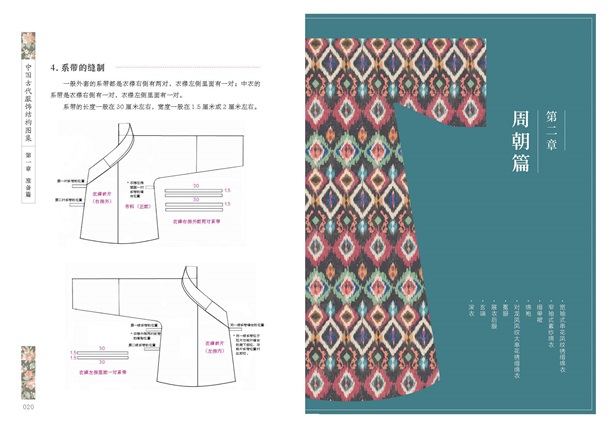 书中每件服饰均为作者手绘,并给出涵盖衣长、通袖长、袖口宽、领缘宽、袖缘宽、裙宽、裙长等的尺寸表,以严谨的版型、数据展示每件衣服的前后片、左右片、袖片、裙片、领片、系带等,各处细节尺寸标注详细,裁剪线、对折线、缝纫线清晰,按图裁剪、制作即可。介绍了裁剪、量体以及所需布料如何计算的方法,为古代服饰制作者、设计者、研究者、爱好者提供了较为详尽的参考资料。