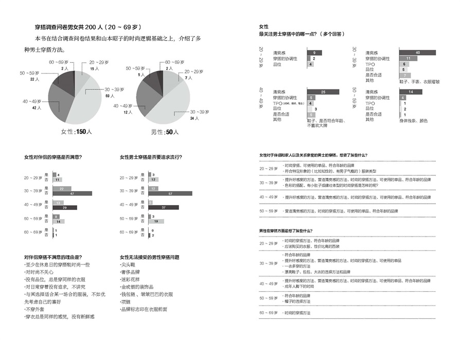 本书由日本人气造型师结合问卷调查结果编写,调查并总结出在女性眼中什么样穿搭的男性更有吸引力,什么样的穿搭给人印象不好,自己更关注男友或丈夫衣着的哪些细节等。是一本一看就懂的男士穿搭基础原理图解。全书共分为三章节,第一章介绍了十件每位男士都一定要有的单品,比如黑色西装外套、白色T恤、小白鞋等,告诉男性读者如何更快速的搭配好这十件基础品。第二章分为三个小节,分别为休闲穿搭、工作穿搭、服装配色,内容更加实用。第三章内容为应对各季节特定活动场合的穿搭推荐,比如春季赏花踏青的穿搭推荐、夏季和伴侣出行的穿搭、秋季公司秋招的商务穿搭、冬季春节回家的穿搭等。