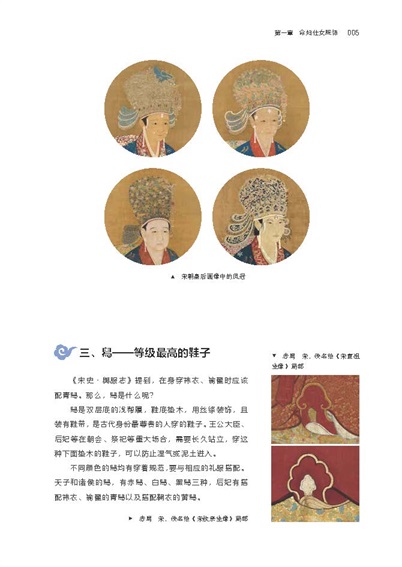 本书以宋代绢本画为主要蓝本,以宋代壁画为辅,搭建了33个场景,大到谒庙朝会、宫宴雅集,小到燕居侍花、耕织斗茶。尝试在特定情境的代入中,阐述命妇仕女、士宦富贾、少年儿童以及庶民百工不同群体的妆束,既涵盖巾帽冠带、衫袍鞋服,又包括发型妆容、纹样配饰。此外,结合汉服在当代生活中的应用需求,搭建了5个虚拟场景。通过古籍文献的考证,呈现宋代冠礼、及笄礼、婚礼的流程以及所穿服饰、所用配饰。