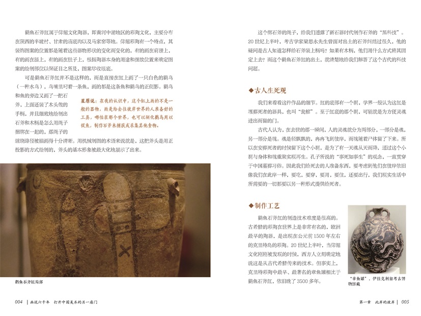 全书共分七章,第一章主要介绍了鹳鱼石斧缸、御龙图等展现古人生死观的器物,探讨中华民族追忆先祖这一文化习俗的历史渊源。第二章细致讲解了敦煌五百强盗成佛因缘图壁画、云冈大佛等佛教艺术在我国古代的发展。第三、四章围绕宫廷艺术品,探讨包括《女史箴图》《韩熙载夜宴图》等体现古代帝王生活样貌的画作。第五章借山水画,介绍作品与画家间的关系,展现了作者的精神面貌与思想。第六章详细介绍了《珊瑚笔架图》《容膝斋图》等艺术作品对新的书画语言的探索与使用,展现了那些表达个性与特定感情的书法作品和文人画接近19世纪起源于欧洲的现代艺术运动的艺术形式,也就是古代的现代。第七章则介绍了以《搜尽奇峰打草稿》《千岩万壑图》为代表的17—19世纪具有独创性的中国艺术作品,它们的出现打破了当时中国艺术上保守陈旧的局面,创造了又一波中国美术创作的高光时刻。