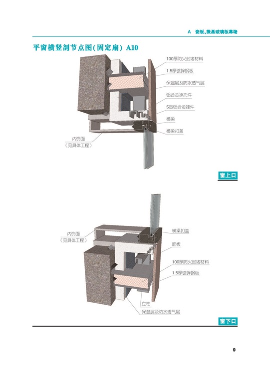 本书介绍的幕墙种类齐全,具体包括瓷板、微晶玻璃板幕墙,陶板幕墙,石材蜂窝板幕墙,纤维水泥板幕墙,高压热固化木纤维板幕墙。每一种幕墙又按不同的连接方式进行节点的分类绘制,具体分类包括:标准横竖剖节点图,层间横竖剖节点图,凹窗横剖节点图,凹窗竖剖节点图,平窗横竖剖节点图(固定扇),门横竖剖节点图,90°转角横剖节点图,135°转角横剖节点图,女儿墙收口、勒脚收口节点图,与室外吊顶相接竖剖节点图,侧封边、与雨篷相接节点图,与其他材质幕墙相接横竖剖节点图,变形缝节点图,等等。