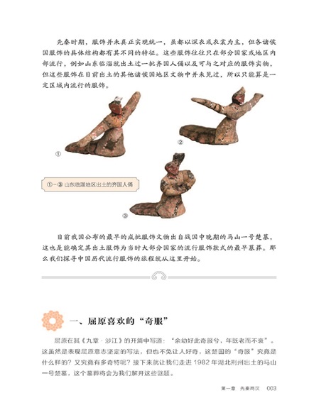 为增强代入感,以大家耳熟能详的屈原、李清照等历史知名人物及所涉及的场景作为引子,从相关的文物、壁画等素材入手,介绍当时的社会环境、工艺技术对服饰的影响,展示、还原出服饰结构示意图及实物样式。每章的后半部分还会提供模特团队穿着以上衣物时的层次示意图,尽可能直观还原出古人实际穿着效果。