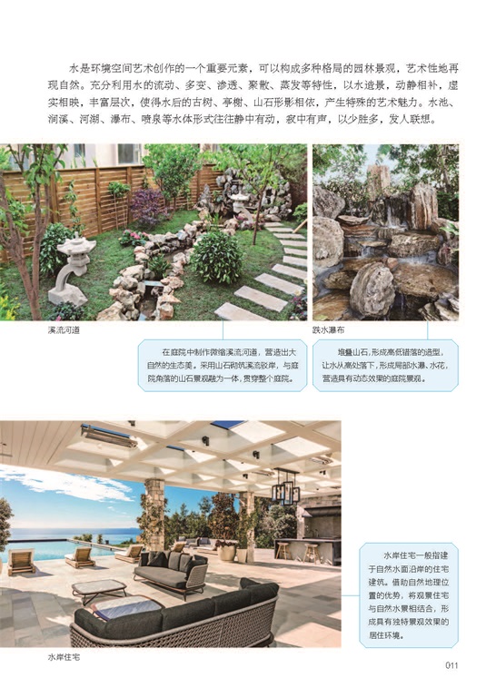 水景类型、水景设计细节及材料;第三章介绍了溪流、水帘瀑布、池塘、水池、游泳池、喷泉、壁泉、滴泉八类水景的设计与施工方法;第四章介绍了水景植物的选择和种植知识;第五章介绍了景观桥、排水排水、水体净化、灌溉系统等相关知识和具体案例。为庭院设计师、景观设计师提供相关参考。