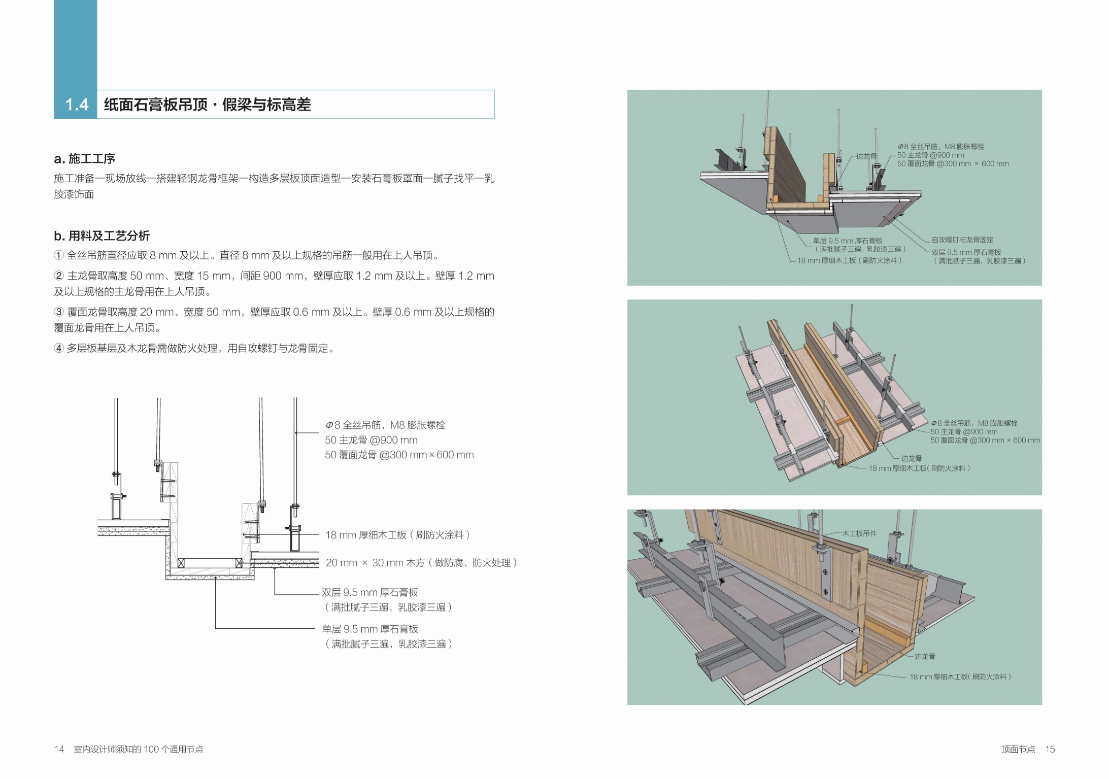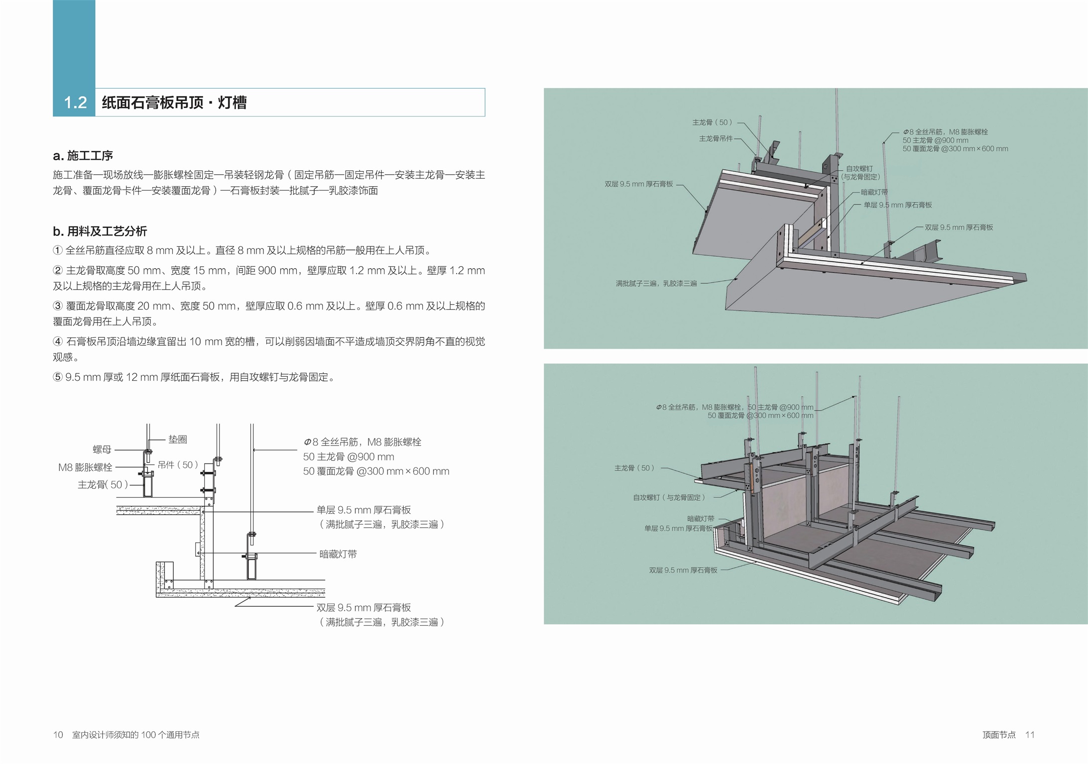 本书共分为三章,总共100多个节点:第一章介绍35个顶面节点,比如轻钢龙骨吊顶、木饰面吊顶、空调风管、石膏板多叠级棚面、玻璃灯箱等的节点用料及工艺分析;第二章介绍27个地面节点,比如地砖铺贴、地热、沐浴间石材内下水槽、推拉门地思等的节点用料及工艺分析;第三章介绍42个墙面节点,比如轻钢龙骨隔墙工艺构造、实木挂板、轻体墙及木饰面与石材踢脚线、复合墙板与白钢包口线等的节点用料及工艺分析。每个节点有解析,解析包括施工工序、工料分析两部分,有CAD图纸,还有SU模型图,图文配合说明,让读者对节点结构、工艺一目了然。