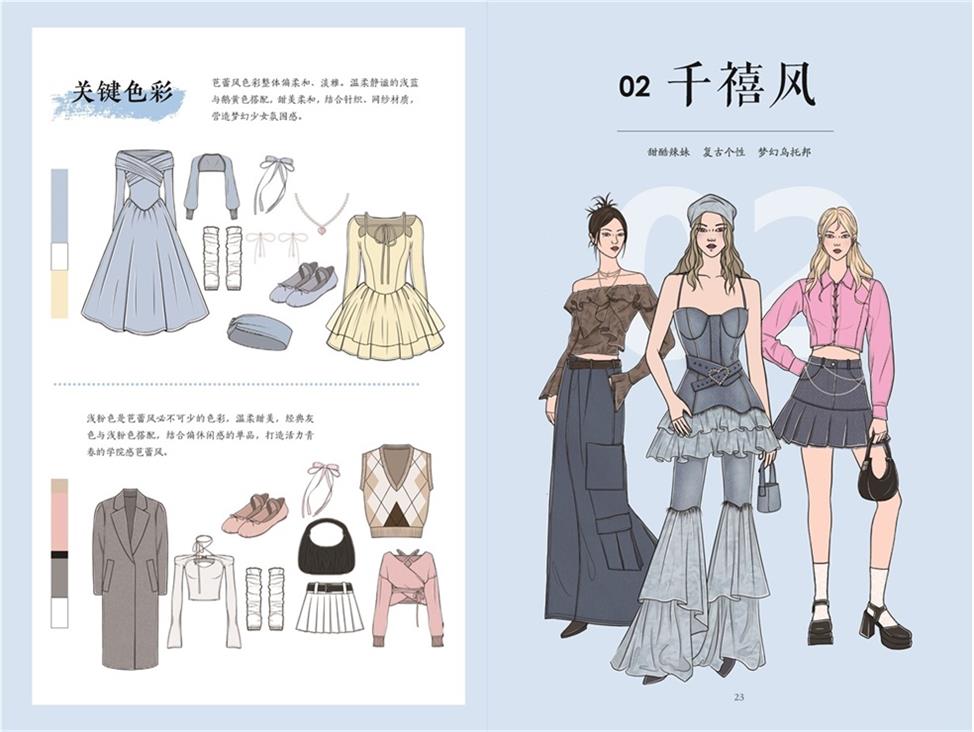 在此基础上,书中进一步解析时装造型风格,如芭蕾风、老钱风、酷飒御姐风、甜酷新中式风等,结合风格调性、关键单品、生活场景、色彩建议与搭配技巧,指导读者如何将人物风格与造型风格进行匹配,打造适合自己的穿搭方案。